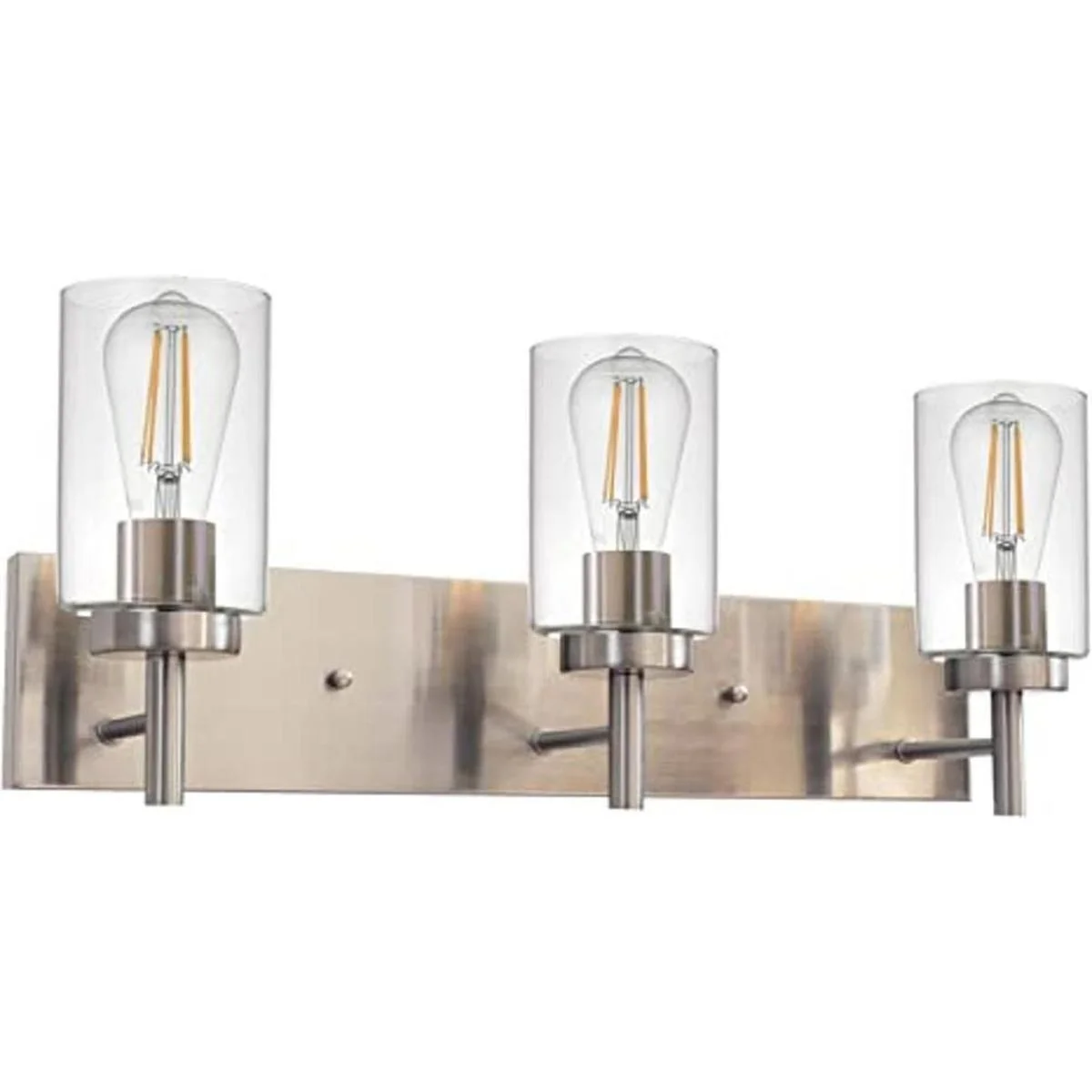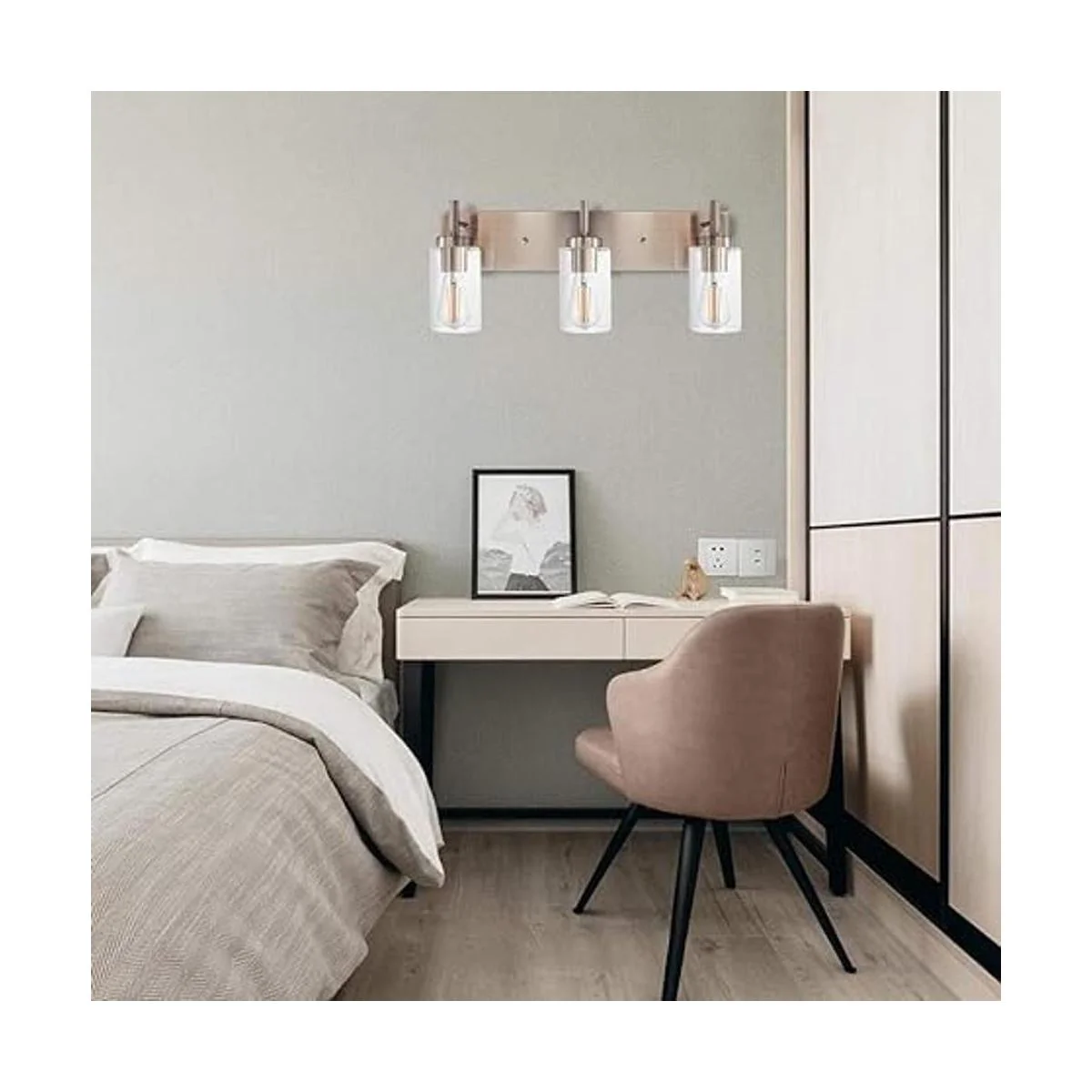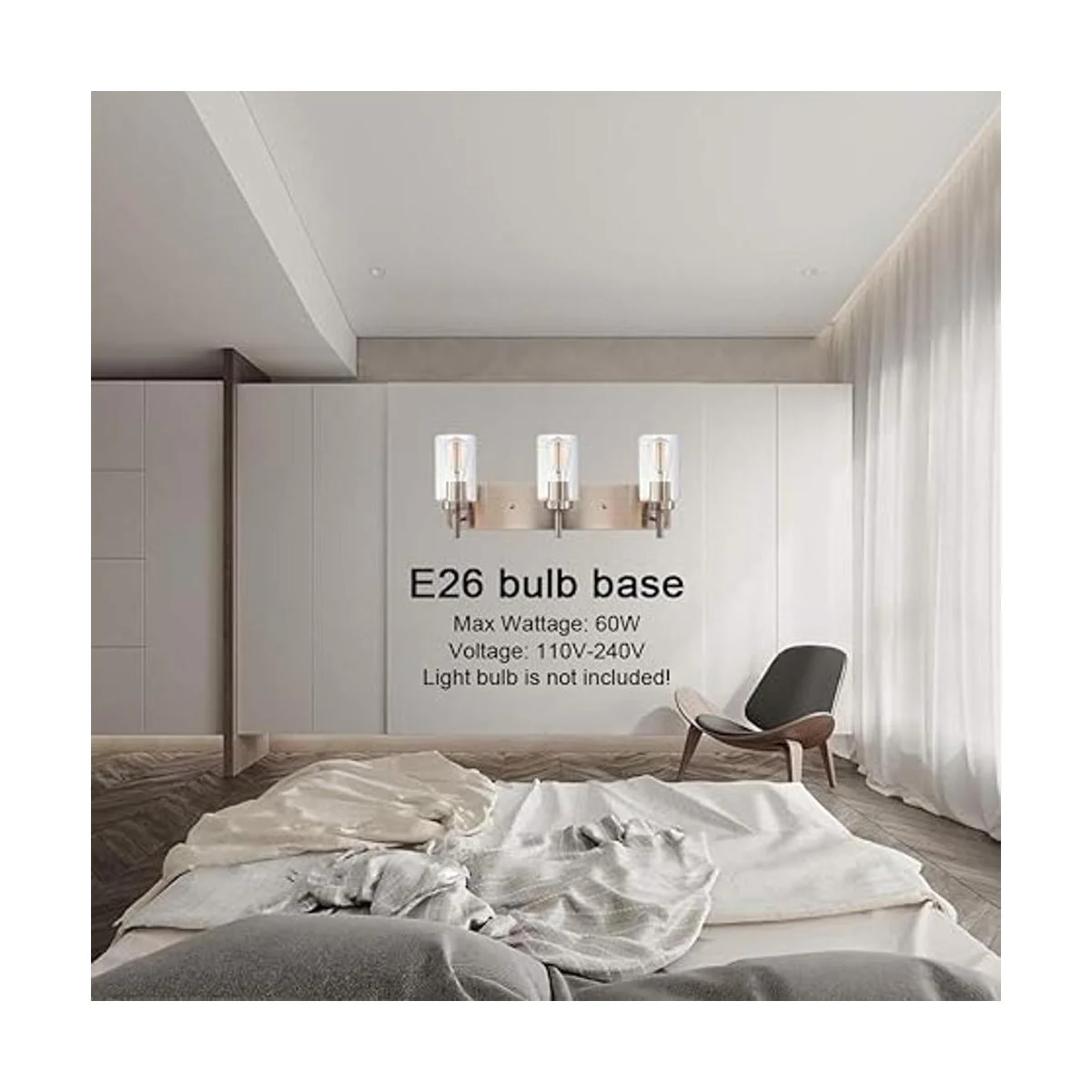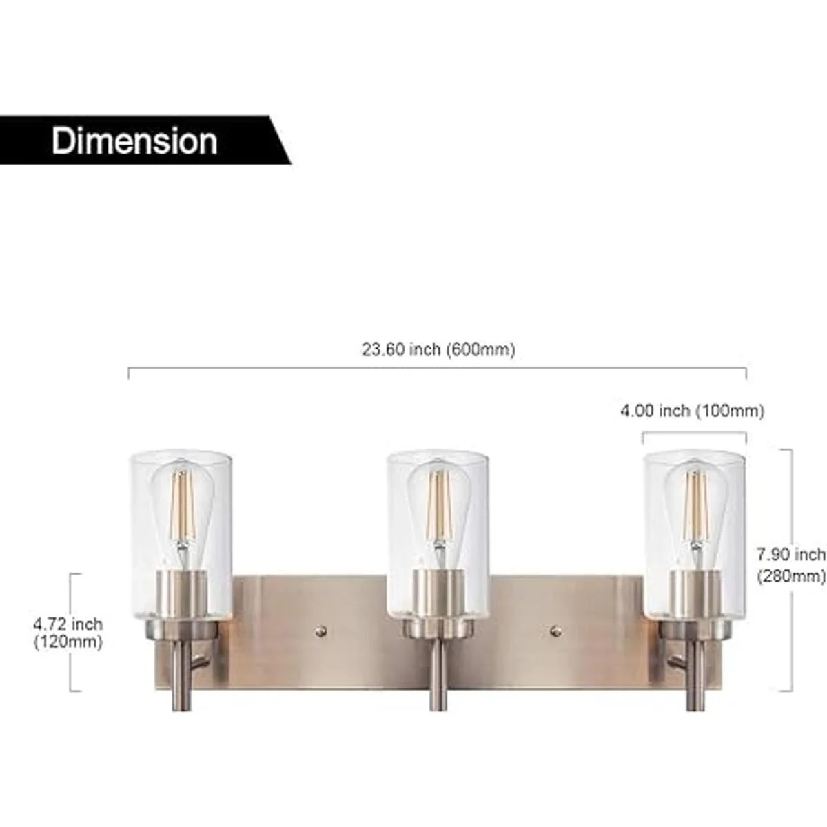 VINLUZ Lámpara de baño de tocador de níquel cepillado, 3 luces, moderna lámpara de pared con pantalla de vidrio transparente, lámpara de pared rústica vintage para porche número de patente US D958,438 S
