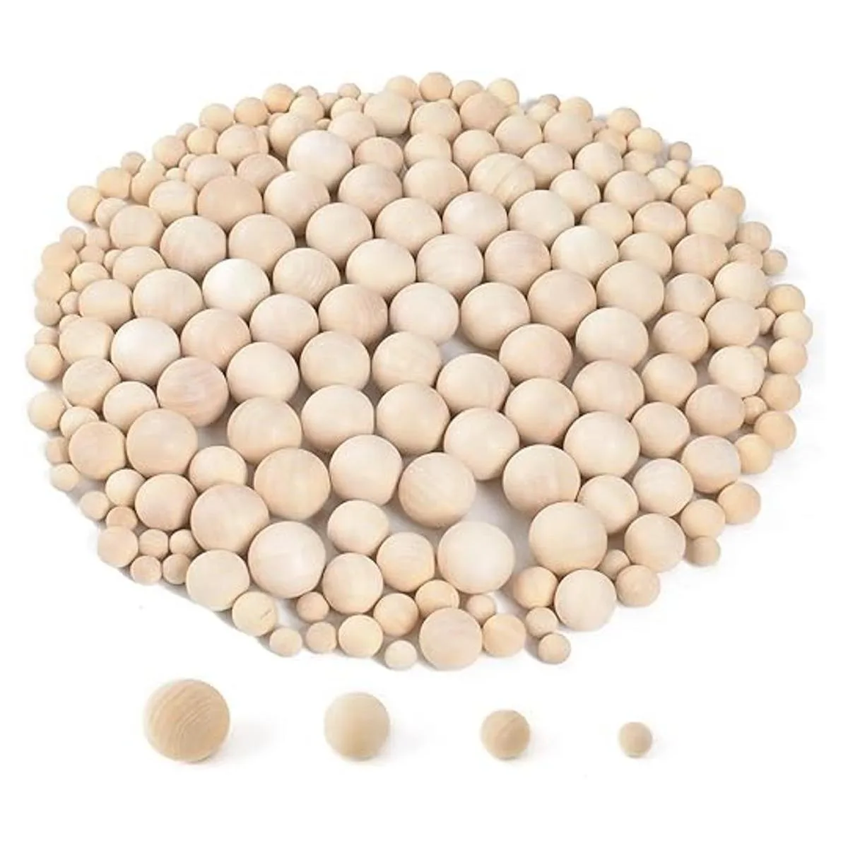 VIOCIWUO 200 bolas de madera para manualidades de madera en 4 tamaños, bolas redondas de madera para proyectos de manualidades, fabricación de joyas, diseño artístico