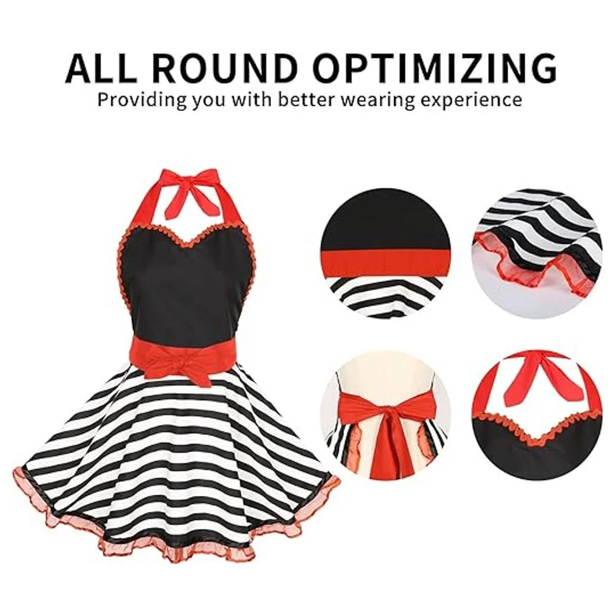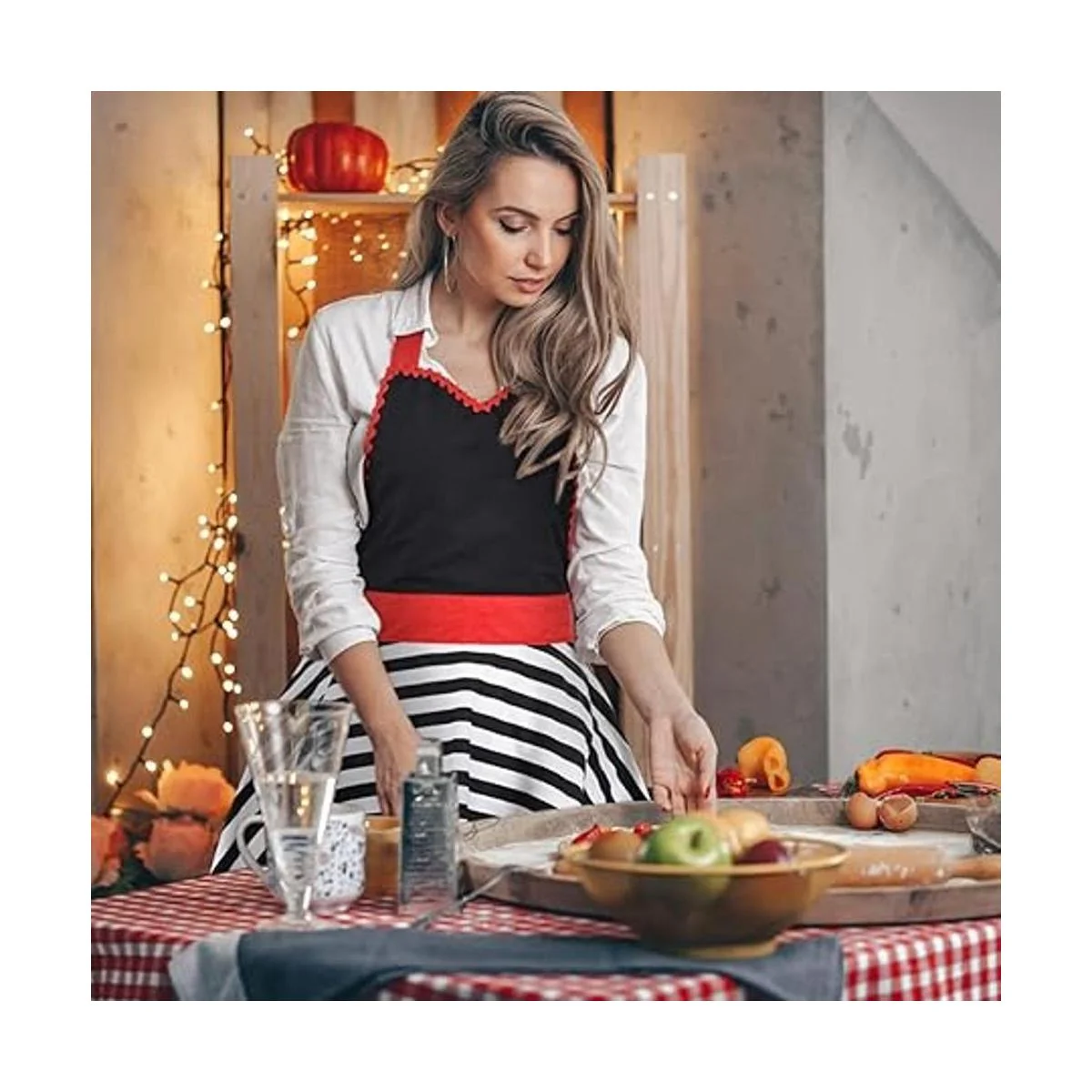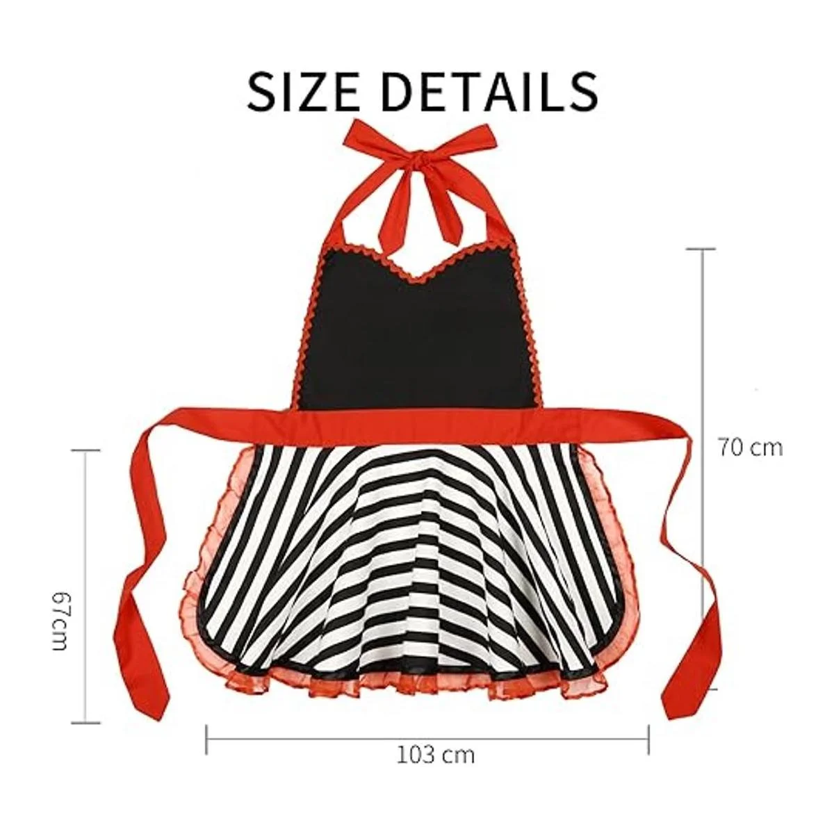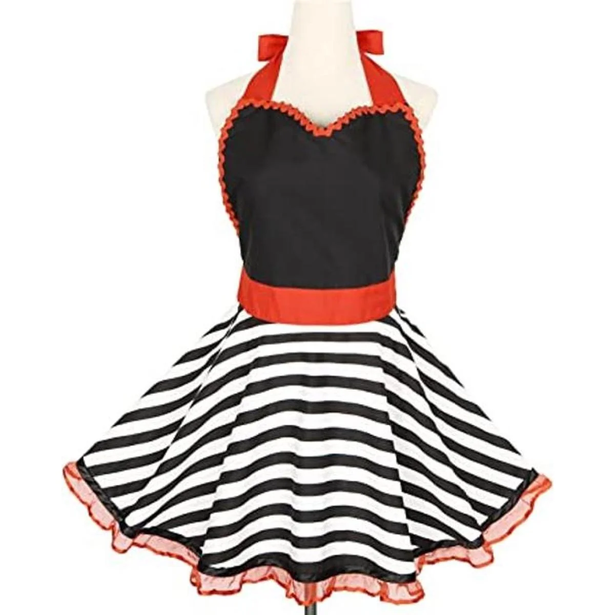 Excelente diseño Bonito estilo retro para mujeres, lindo y juguetón, añade diversión diferente a la cocina. La correa flexible para el cuello se puede ajustar para un uso más cómodo, y los lazos largos están diseñados para adaptarse a la mayoría de tamaños. La cubierta de pecho a rodilla protege tus prendas de derrames, grasa de cocina, manchas de alimentos, agua, etc.