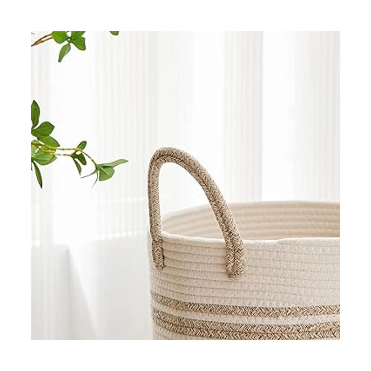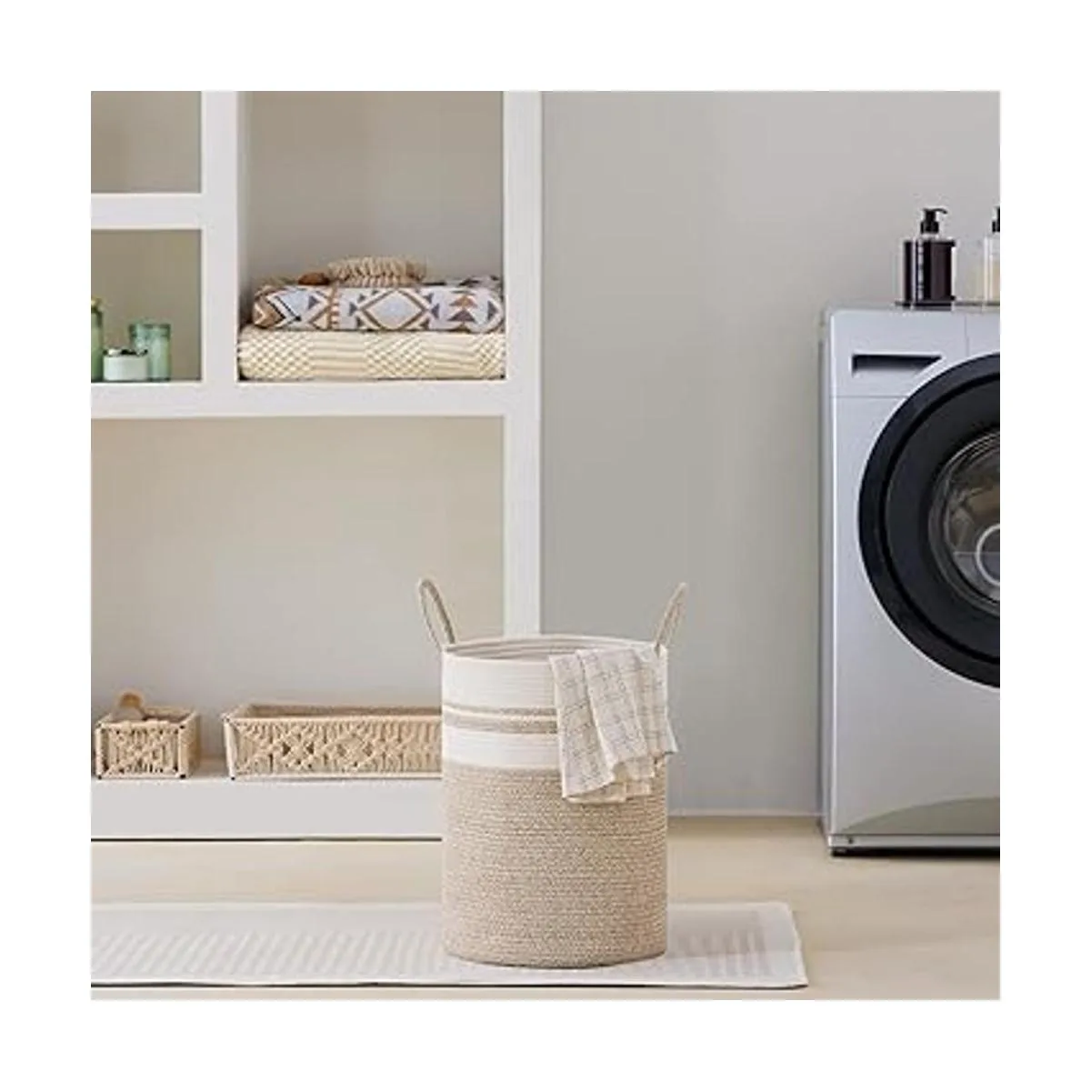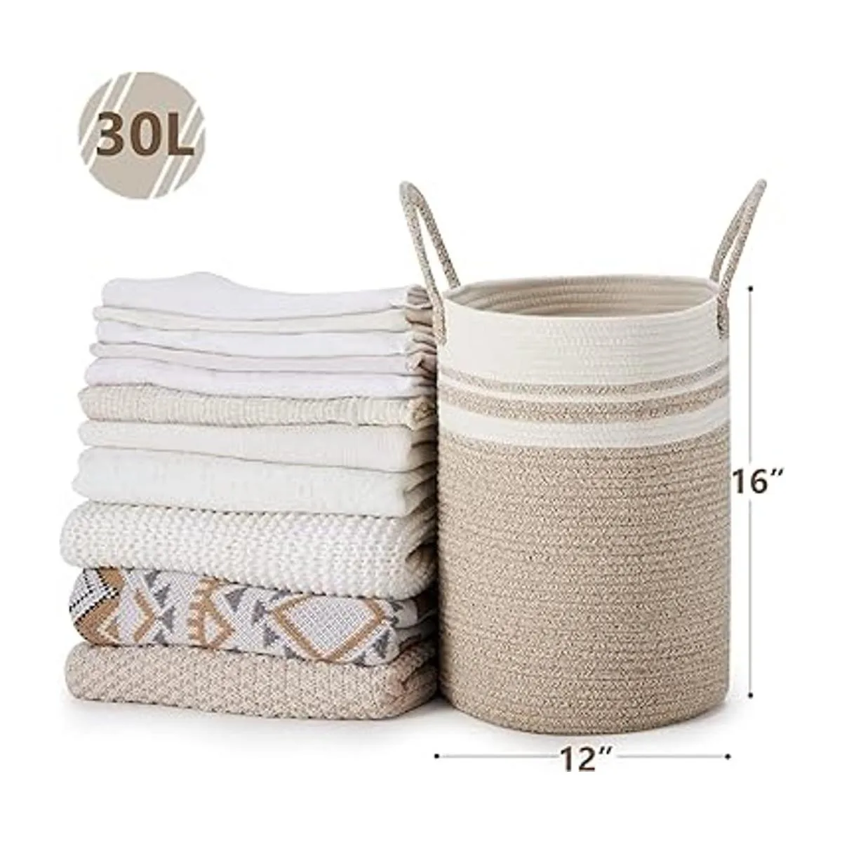 VIPOSCO Cesta alta para la lavandería, cesta de almacenamiento de cuerda tejida para mantas, juguetes, ropa sucia en la sala de estar, el baño, el dormitorio, 30L marrón y blanco