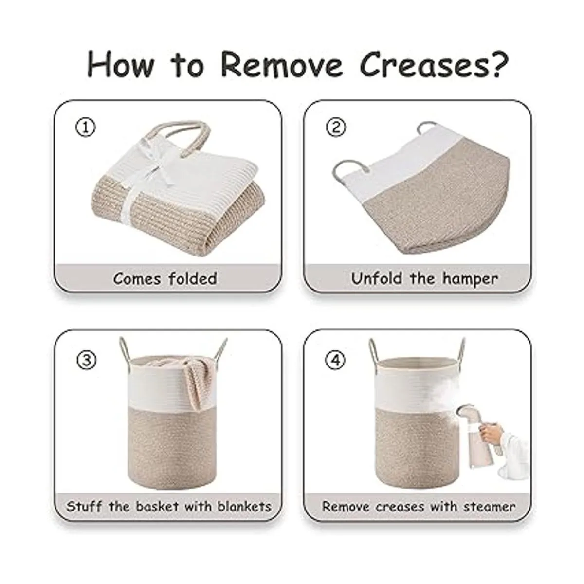 Restaura la forma elegante: para mejorar la eficiencia del envío, las cestas plegables de cuerda tejida se empaquetan de forma compacta. Puedes poner algunas mantas o edredones pequeños en ella y darle un poco de tiempo para recuperar su forma. La plancha es una gran idea para eliminar las arrugas.