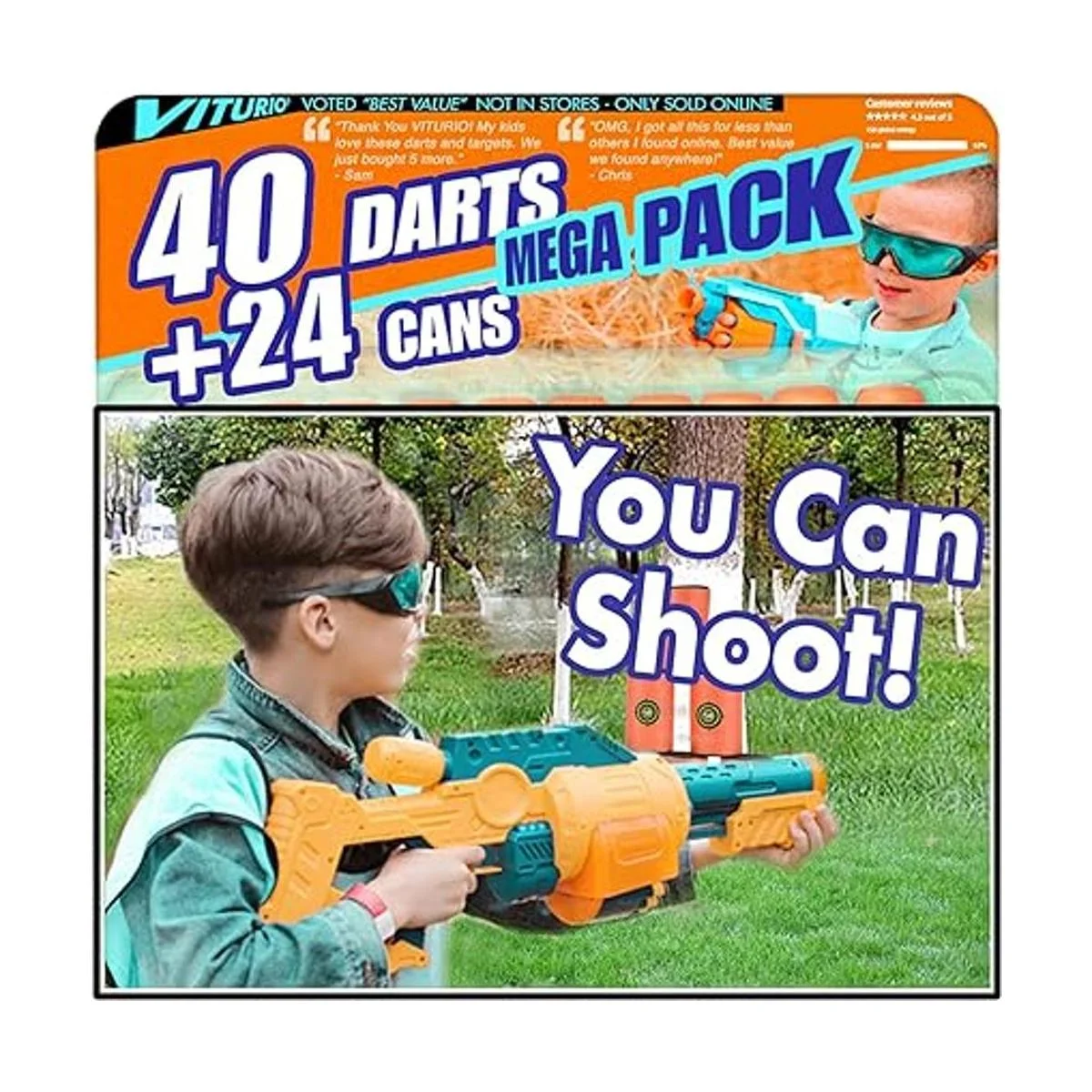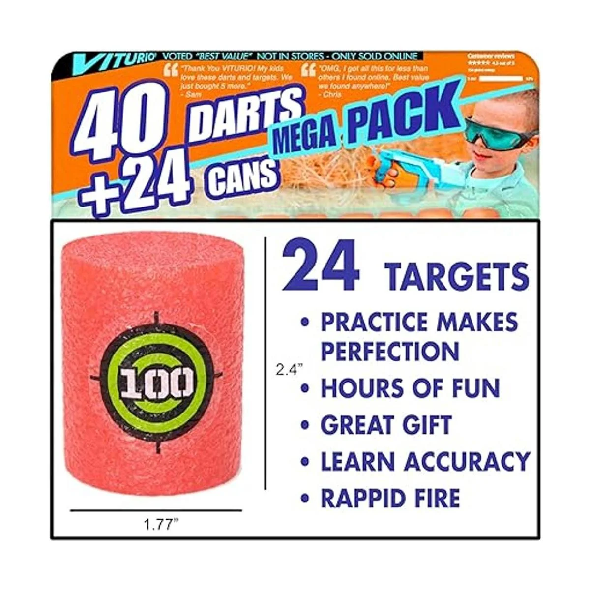 Viturio Juego de 24 objetivos de espuma suave para Nerf N Strike, pistola, pistola y 40 latas de dardos balas suaves 64 piezas en total práctica de disparo, lanzadores de juguete, niños y niñas