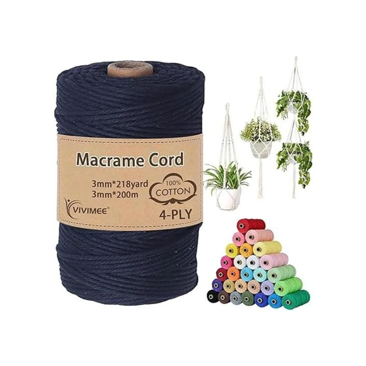 Vivimee Cuerda de macramé de algodón natural de 0.118 in x 218 yardas, cuerda de macramé de algodón natural de 4 hilos, cuerda de algodón de colores para manualidades, tejer, colgar en la pared azul oscuro