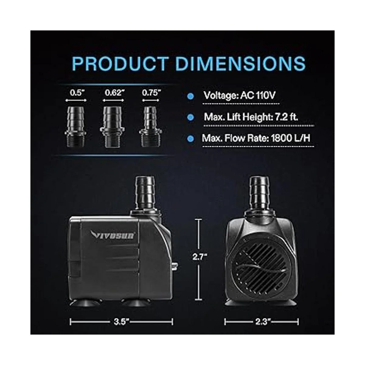 VIVOSUN Bomba sumergible de 480 GPH 1800 LH, 25 W, bomba de agua ultra silenciosa con elevación de 7.2 pies de alto, bomba de fuente con cable de alimentación de 5 pies, 3 boquillas para pecera, acuario, estatuario, hidroponía