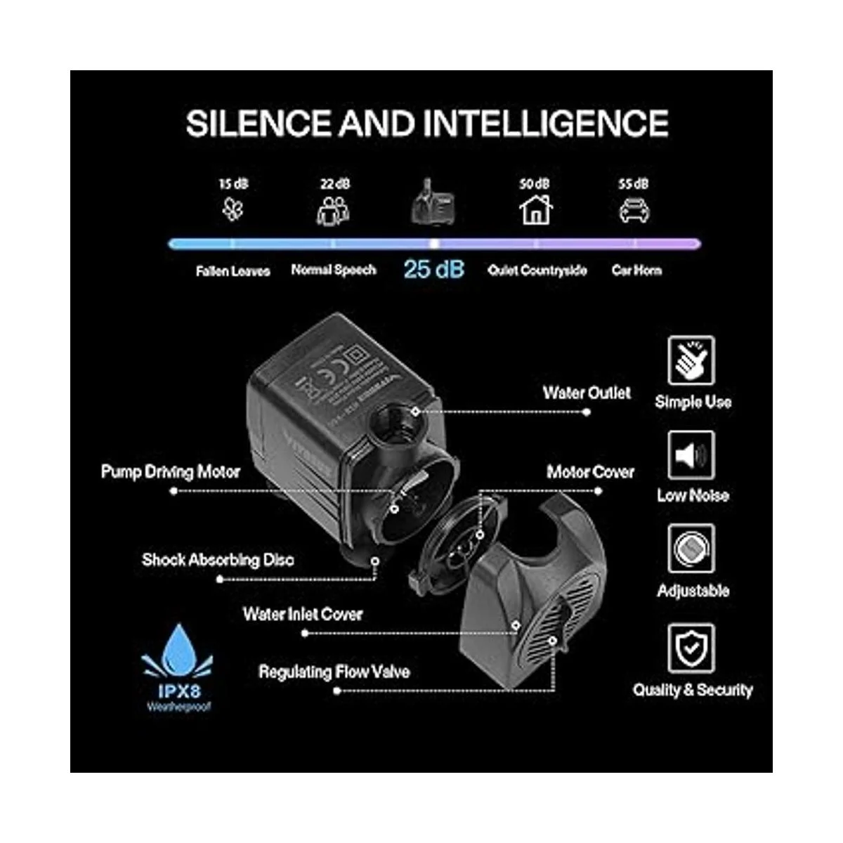 Especificaciones: Dimensiones: 3.5 x 2.7 x 2.3 pulgadas. El cable de alimentación de tres núcleos de 5 pies de largo ofrece una instalación cómoda donde lo necesites, y la válvula de regulación de flujo ajustable te permite controlar el caudal de agua, por lo que puedes obtener la cantidad de presión de agua que deseas; máx. Caudal: 480 GPH 1800 L/H; Máx. Altura de elevación: hasta 7.2 pies; vatios: 25 W. Voltaje: 110 V