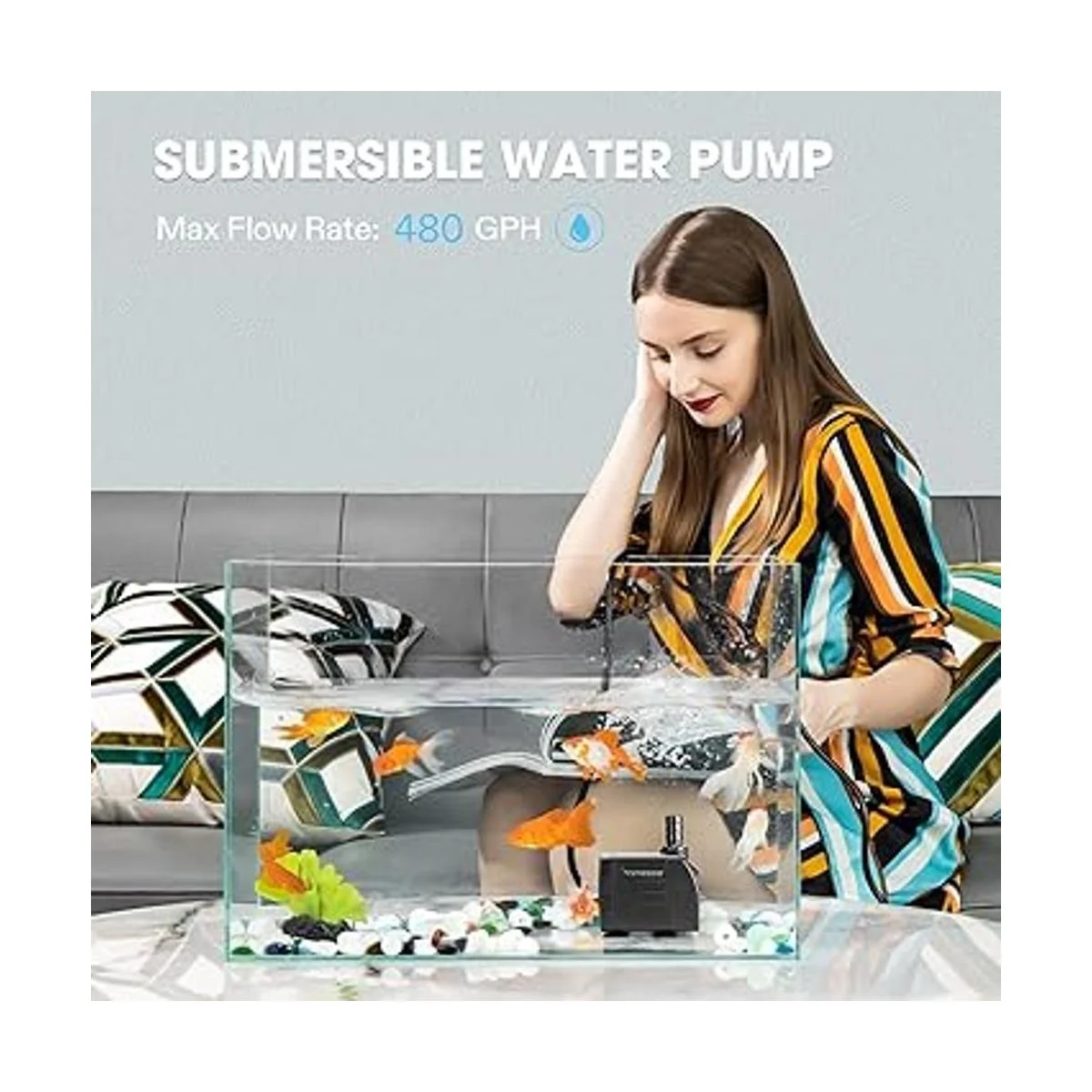 VIVOSUN Bomba sumergible de 480 GPH (1800 L/H, 25 W), bomba de agua ultra silenciosa con elevación de 7.2 pies de alto, bomba de fuente con cable de alimentación de 5 pies, 3 boquillas para pecera, acuario, estatuario, hidroponía