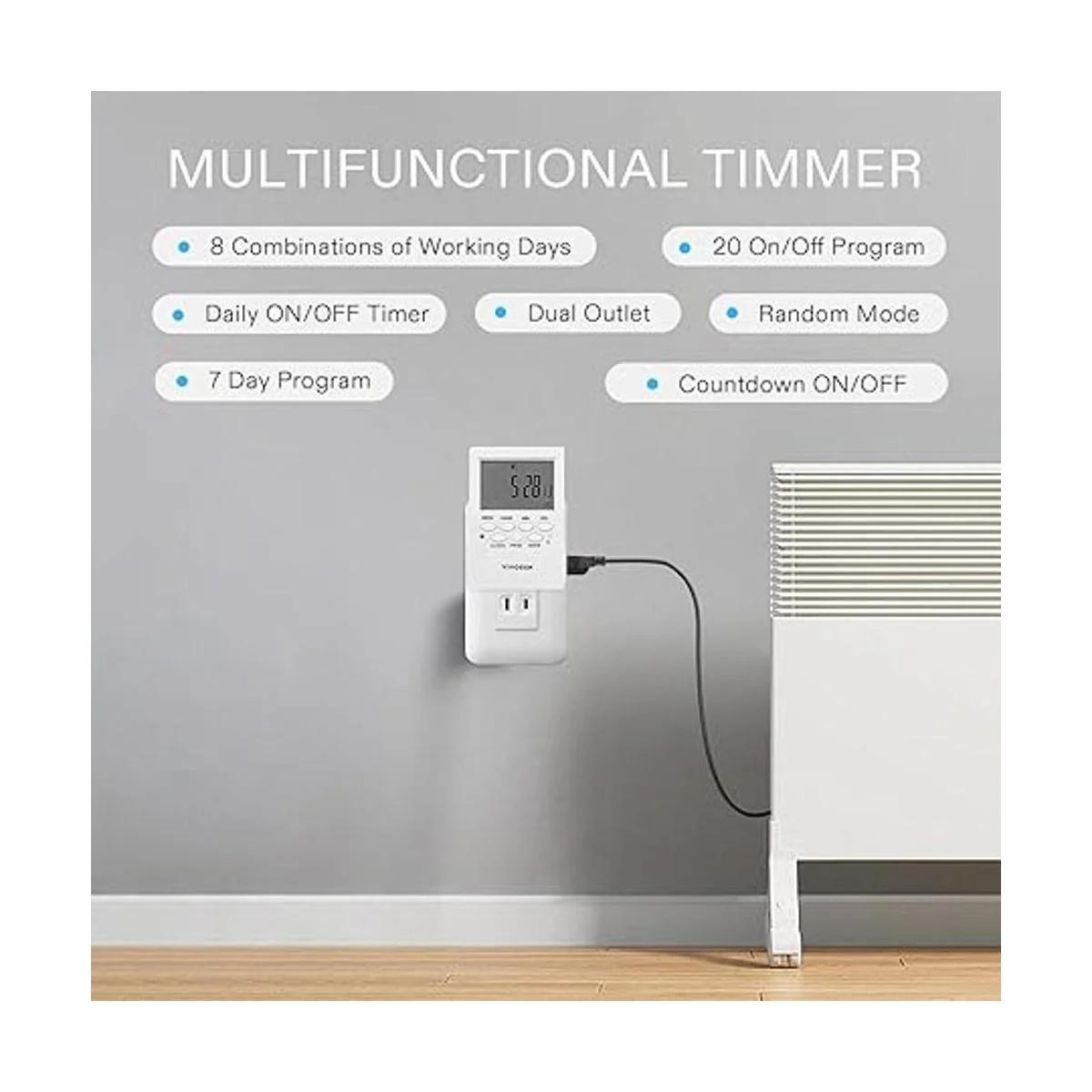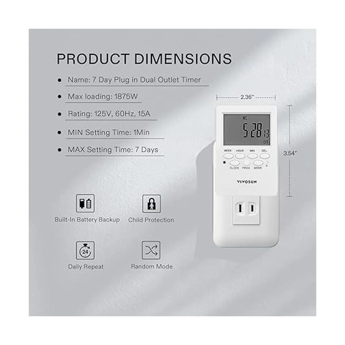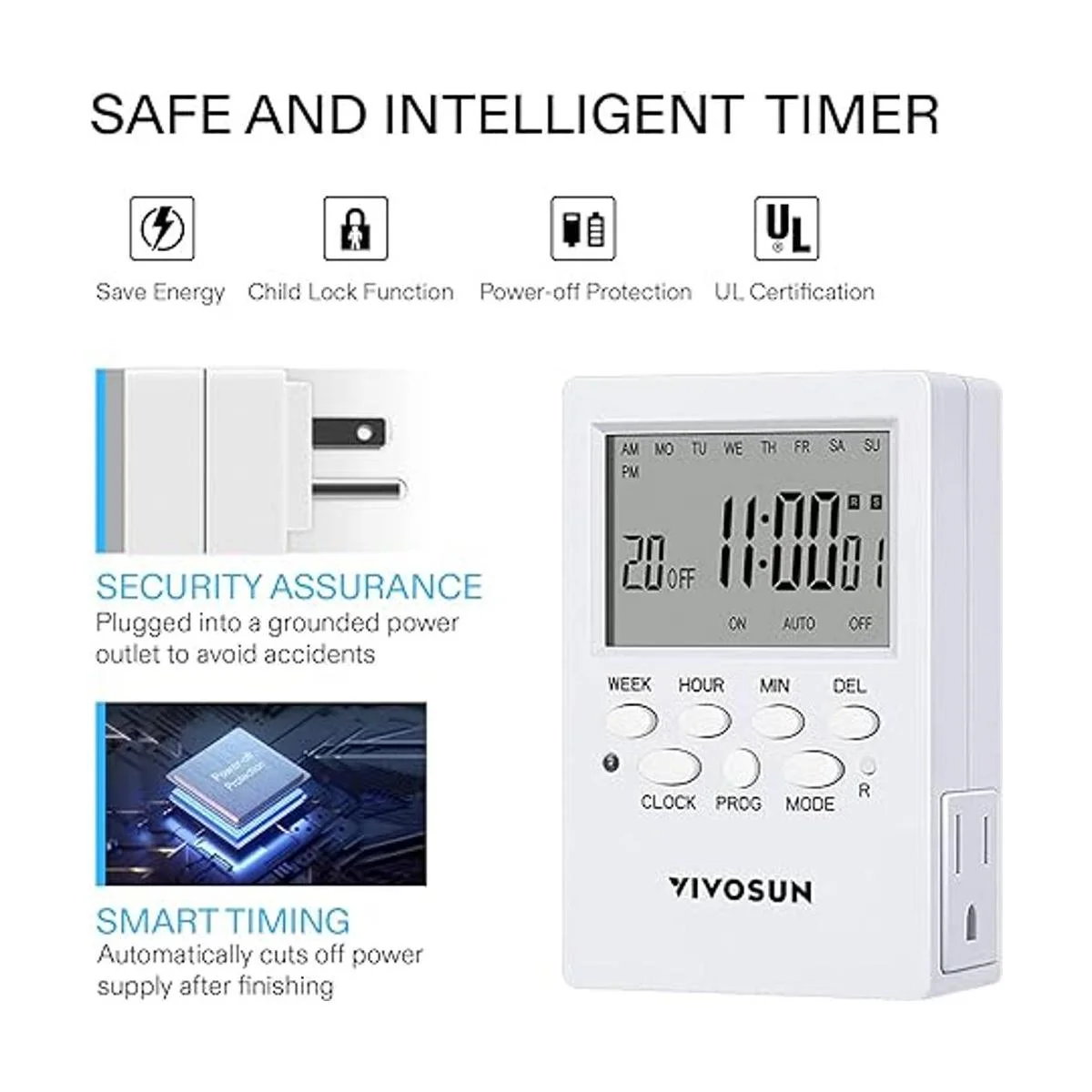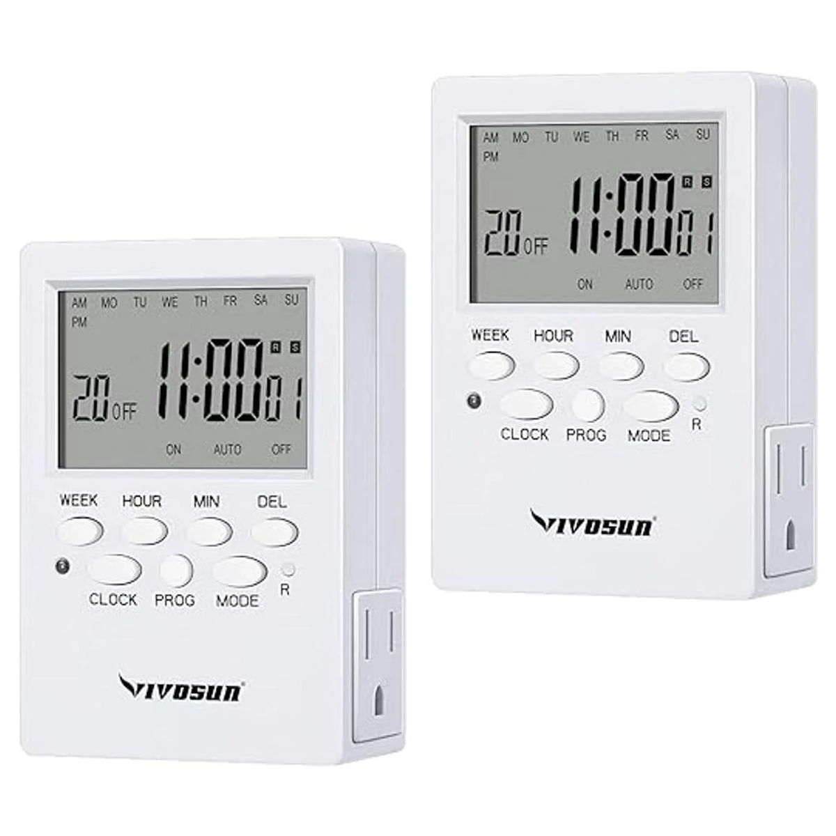 VIVOSUN Temporizador digital programable de 7 días con doble toma, 20 encendidoapagado con certificación UL, temporizador de salida de enchufe resistente con ajuste de cuenta regresiva, interior para lámpara, ventilador, calentador, humidificadores, acuario paquete de 2