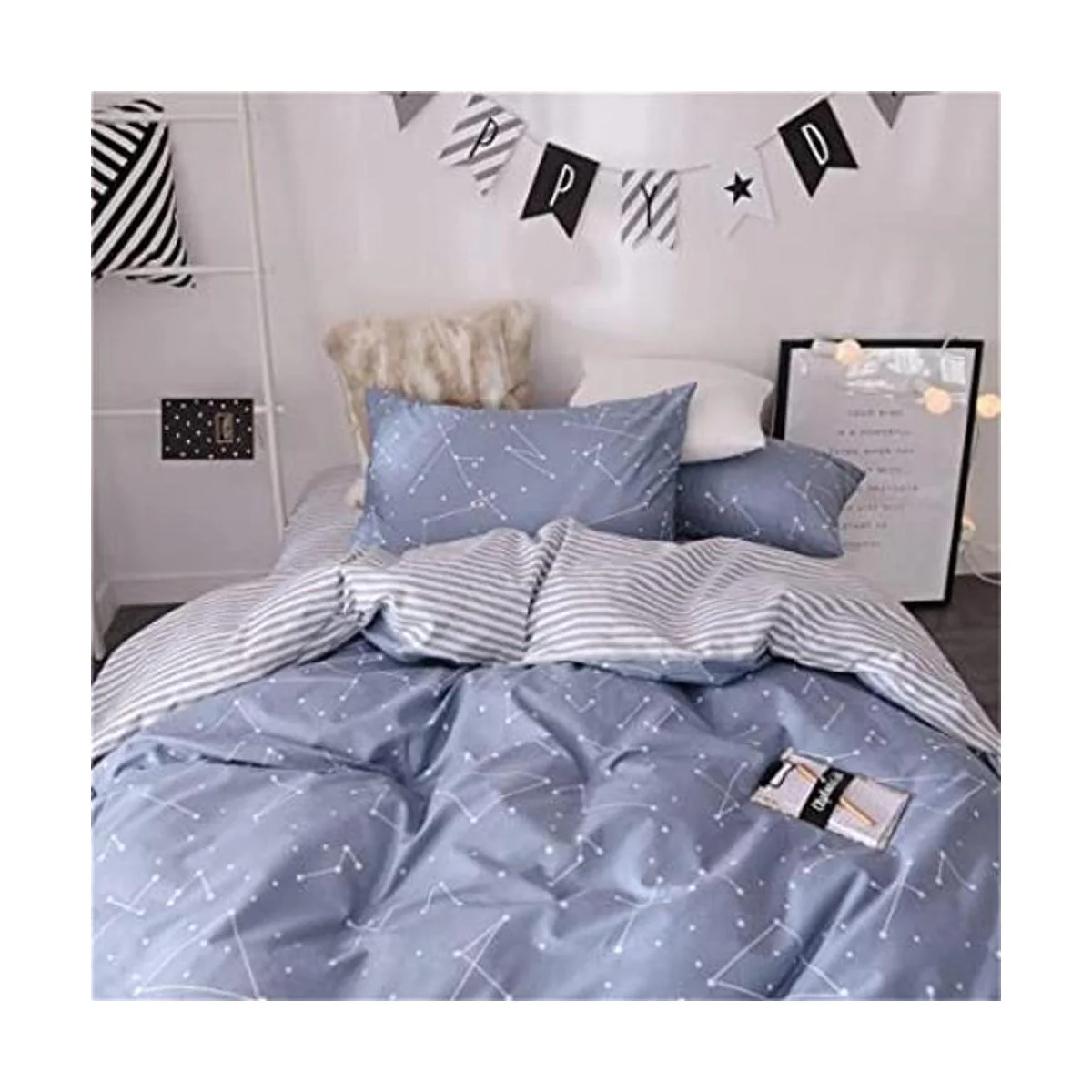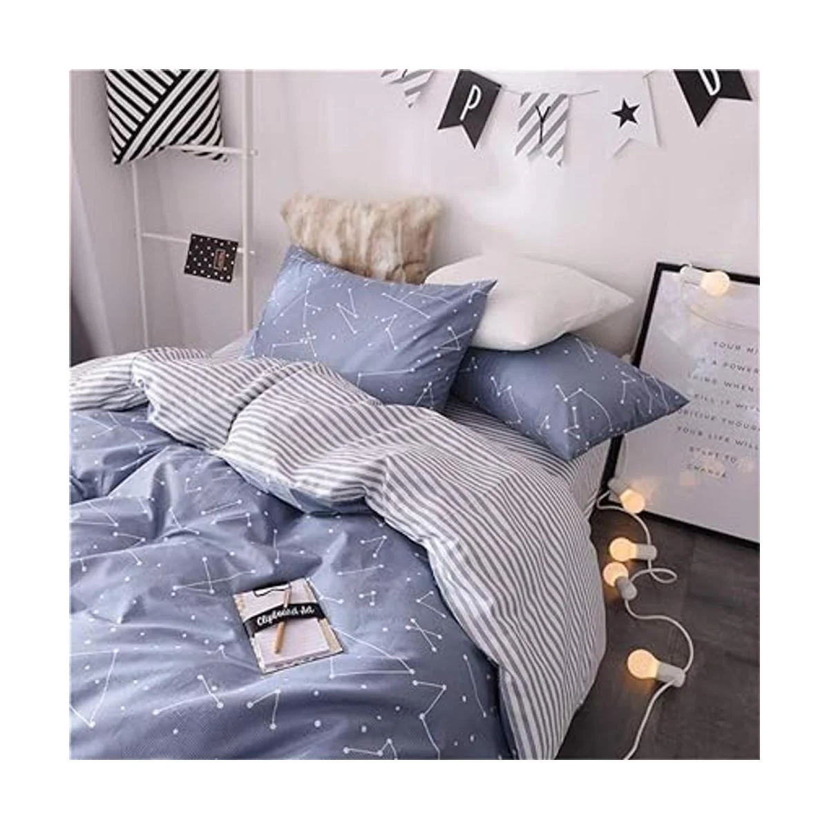La funda de edredón con patrón de constelación azul gris tiene una línea de puntos que atraviesa el azul, juego de cama con temática de galaxia espacial, reversible como patrón de rayas grises y blancas, simple y moderno para tus hijos y niñas.
