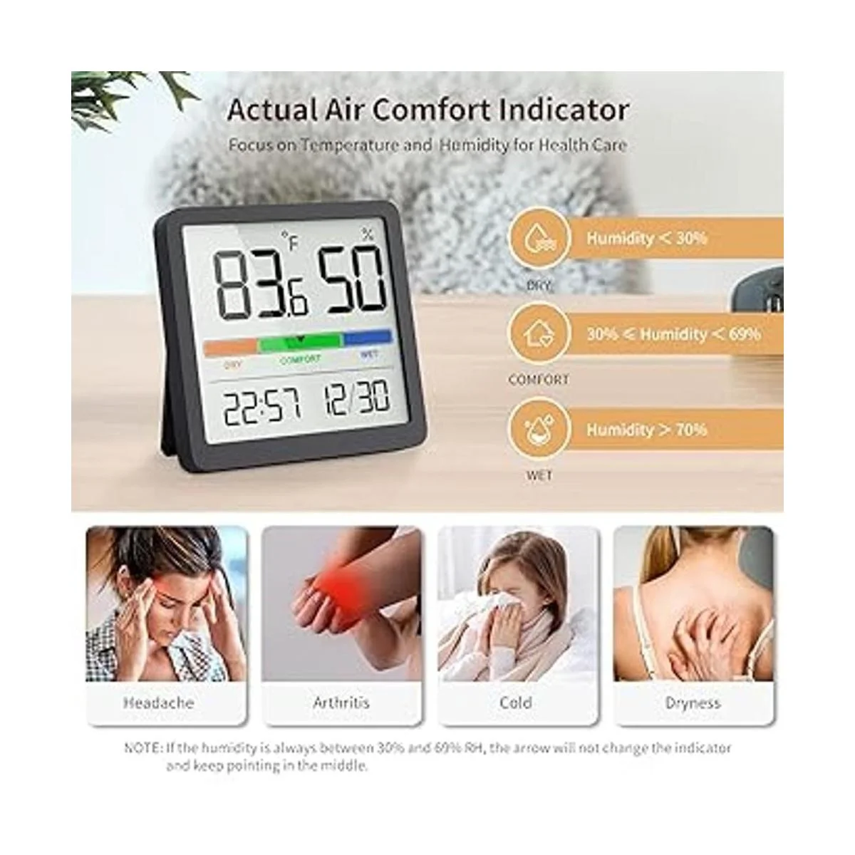 Indicador de comodidad de aire de 3 niveles: la exclusiva barra de color transparente indica el aire seco y cómodo y húmedo rápidamente con solo un vistazo. Garantiza una humedad adecuada, ideal para monitorear las condiciones de vida familiar y la salud evitando resfriados, piel seca, asma, alergias, moho, etc.