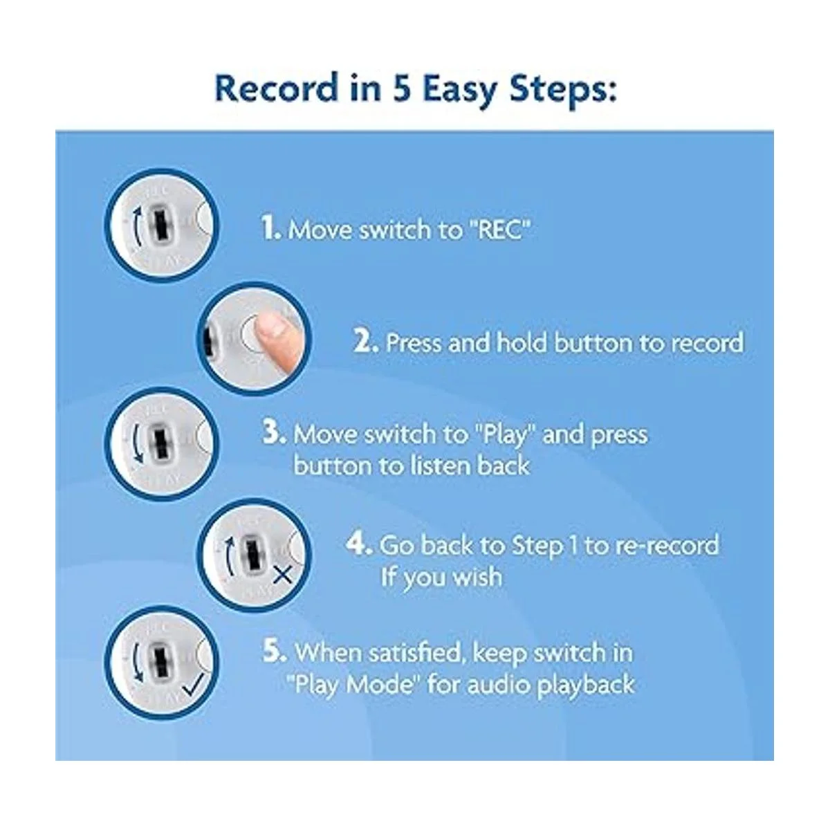 Regraba fácilmente tu mensaje en el dispositivo tantas veces como quieras; el audio se guarda incluso si las baterías están agotadas o reemplazadas; las baterías en la grabadora de voz son fácilmente reemplazables; mira video para instrucciones paso a paso sobre cómo reemplazar las baterías de tu dispositivo de grabación
