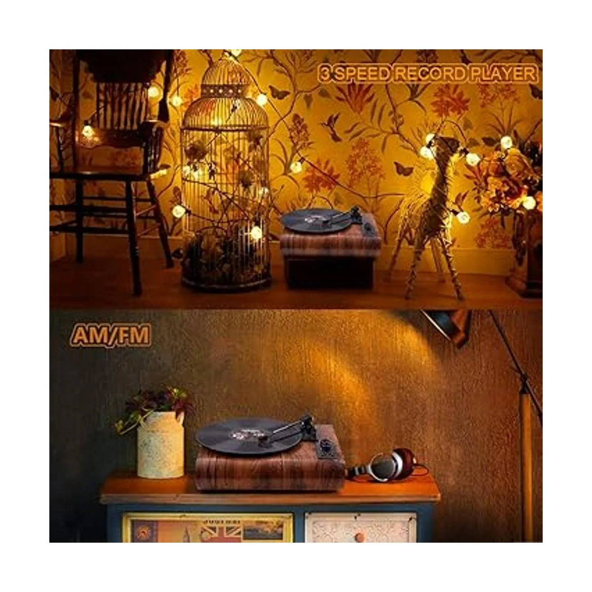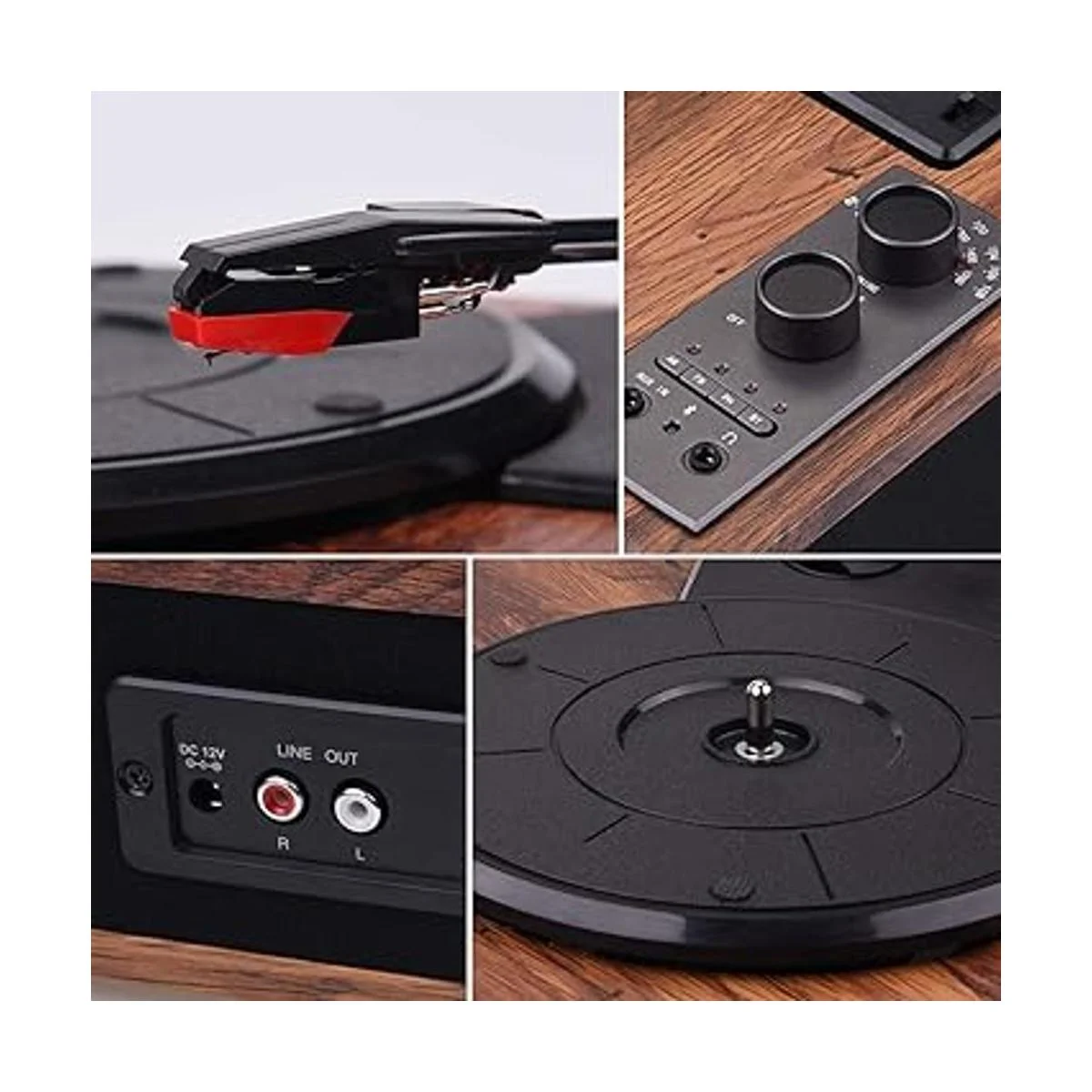 VOKSUN Tocadiscos vintage de 3 velocidades, reproductor de discos LP con altavoz estéreo integrado, función AMFM y salida auxiliar y RCA, madera natural