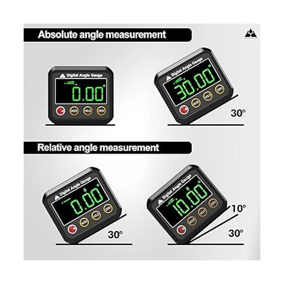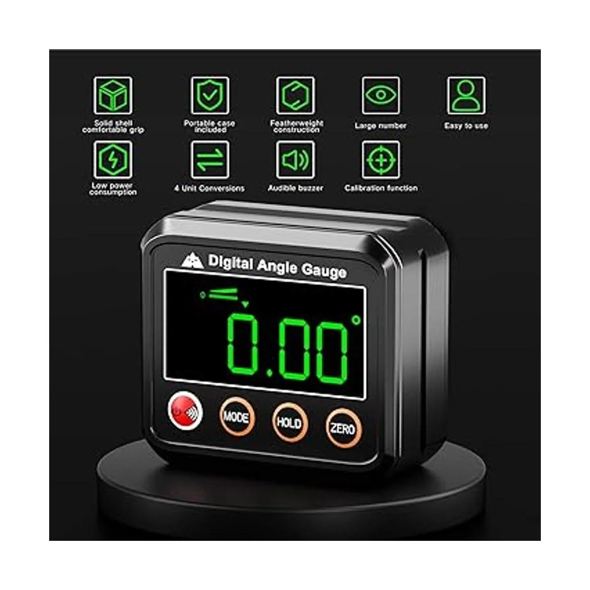 Potentes funciones: dos modos de medición medición de ángulos absolutos y relativos. Cuatro unidades: grados, , mm/m e IN/FT; base magnética integrada fuerte; 4. Bordes con ranura en V fácilmente colocados en superficies curvas como tuberías; apagado automático después de 3 minutos sin ninguna entrada o movimiento; pantalla reversible automática cuando el medidor está boca abajo; botón de retención valor de medición de corriente congelada; zumbador audible cuando está dentro de 1 en la posición horizontal o vertical; función de calibración
