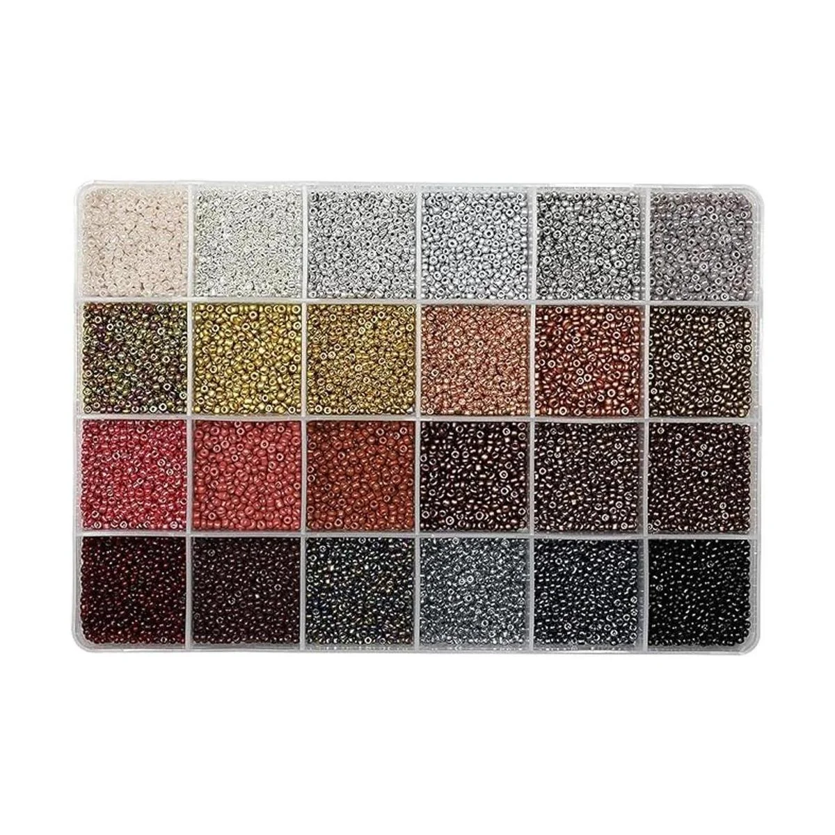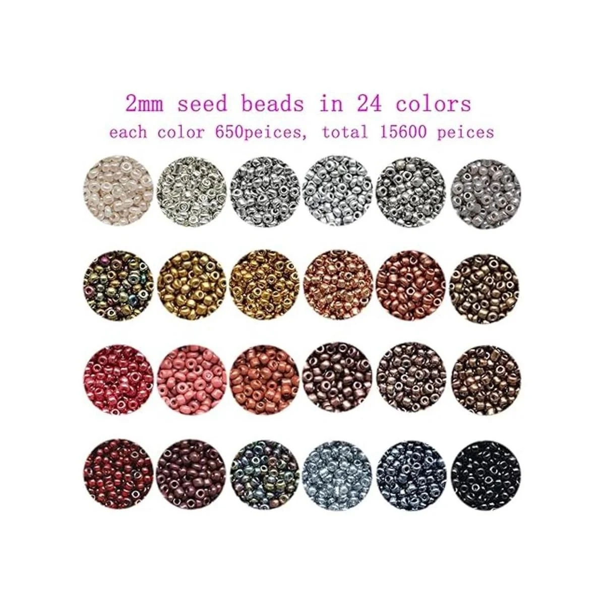 Aproximadamente 15600 cuentas pequeñas de semillas incluyen 24 colores y cada color tiene 650 piezas.