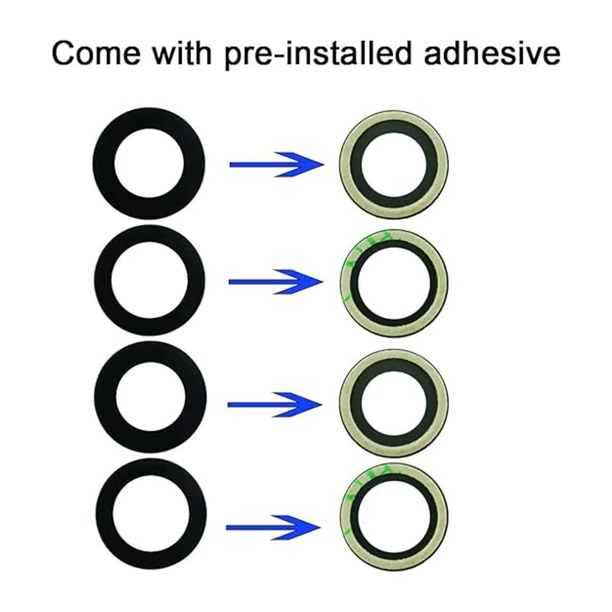 hay 2 juegos 4 piezas en total en el paquete, la lente de cristal de la cámara con fuerte adhesivo preinstalado, hace que sea fácil de instalar.