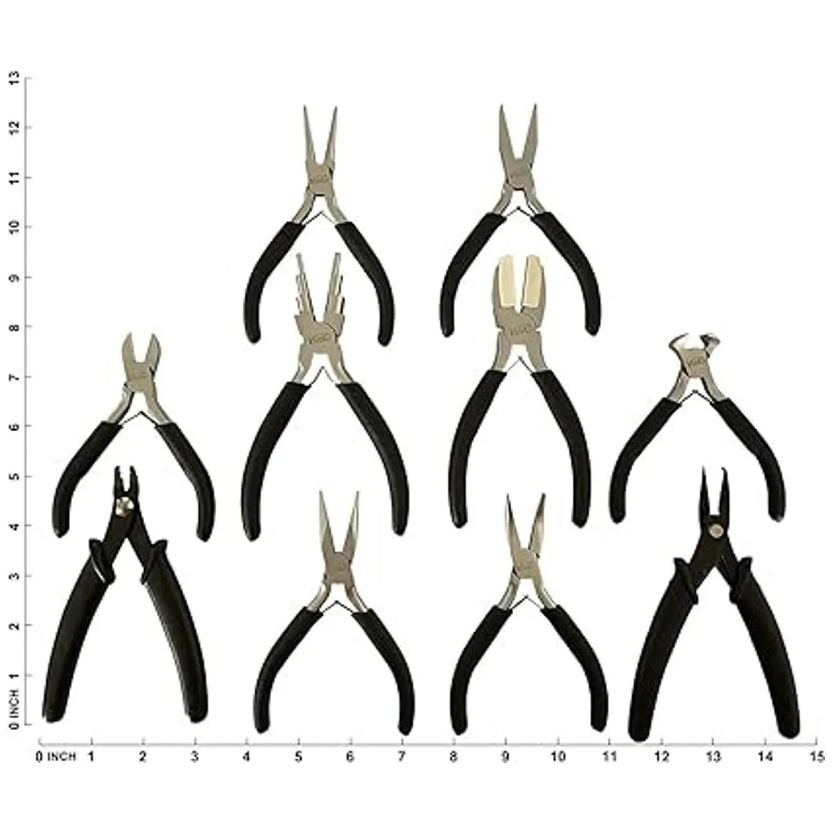 Contenido del producto: alicates para hacer fianzas de 6 pasos, alicates de mandíbula de nailon, alicates de punta redonda, alicates de punta doblada, alicates de punta plana, alicates de corte lateral, alicates de punta de cadena, alicates de crimpado, alicates de anillo dividido y pinzas finales.