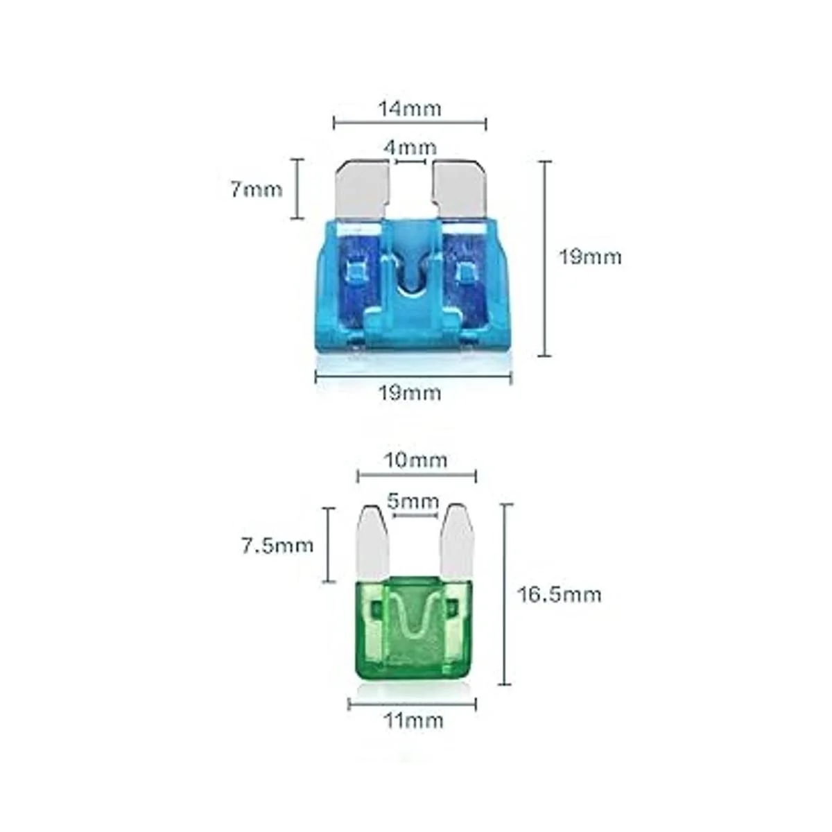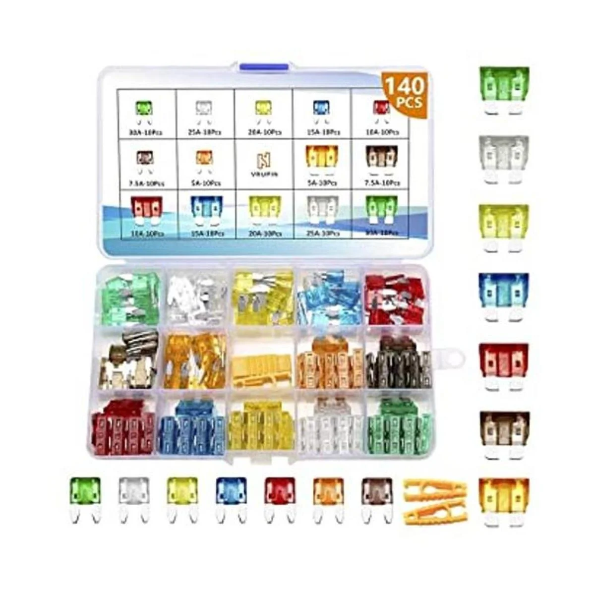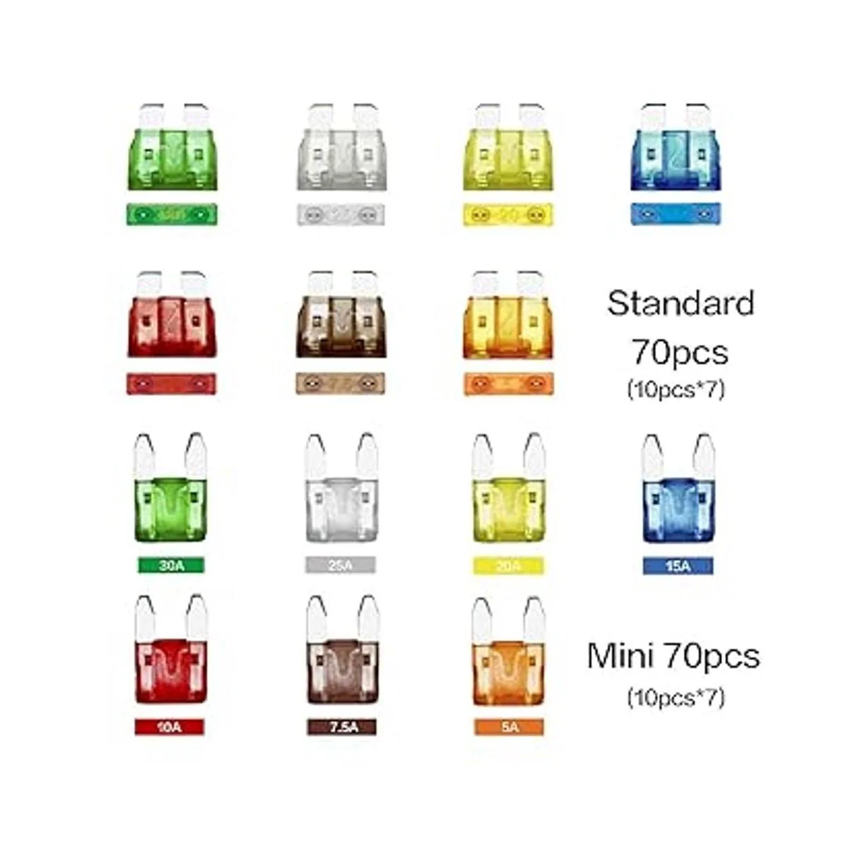 Contenido del paquete: el kit de fusibles para coche incluye: 70 mini fusibles: 5A/7.5A/10A/15A/20A/25A/30A 10 piezas de cada modelo, 70 fusibles estándar: 5A/7.5A/10A/15A/20A/20A/25A/30A 10A PCS de cada modelo, PCS de cada y 2 extractores de fusibles.