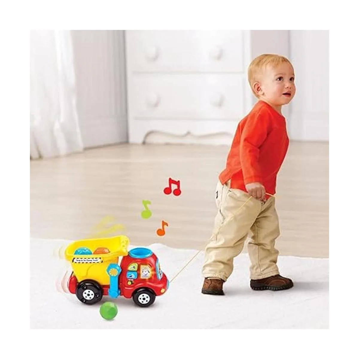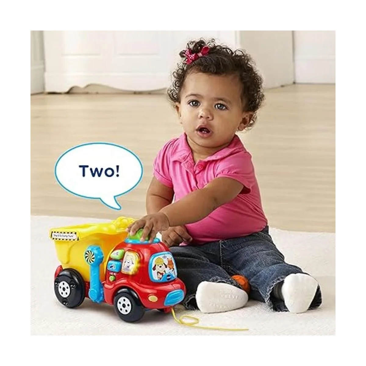 Deja caer una roca colorida en la parte superior de este alegre juguete de camión volquete y mira cómo se cae en el cubo para aprender números