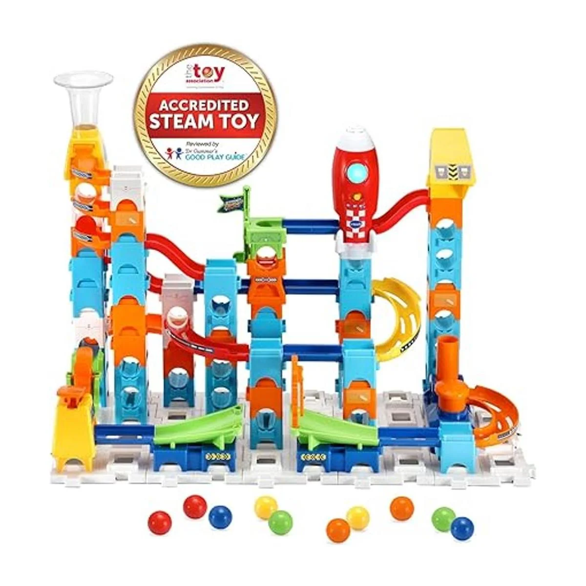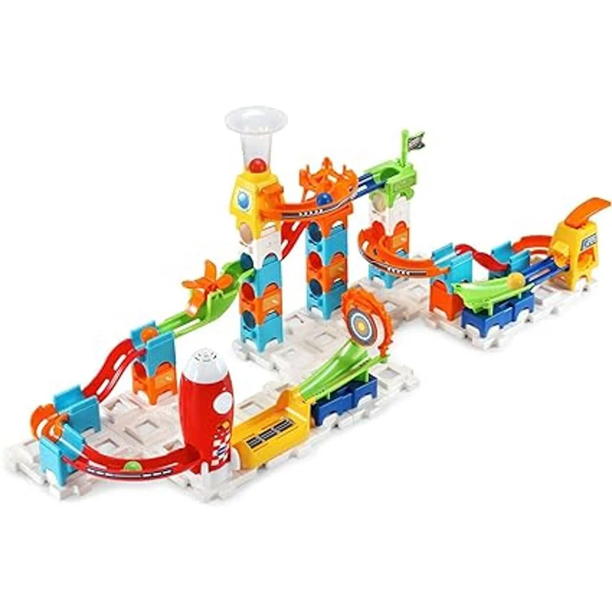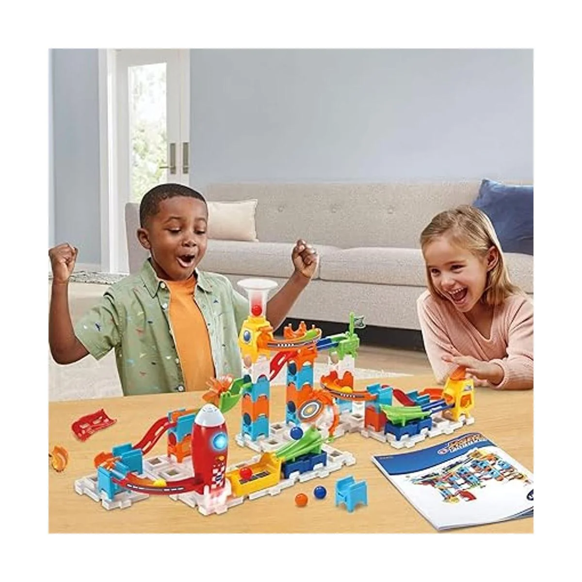 Este juego de construcción codificado por colores incluye 79 piezas de construcción y cuenta con un cohete musical de espectáculo de luz, pistas rápidas, lanzadores extremos y más que se conectan fácilmente juntos