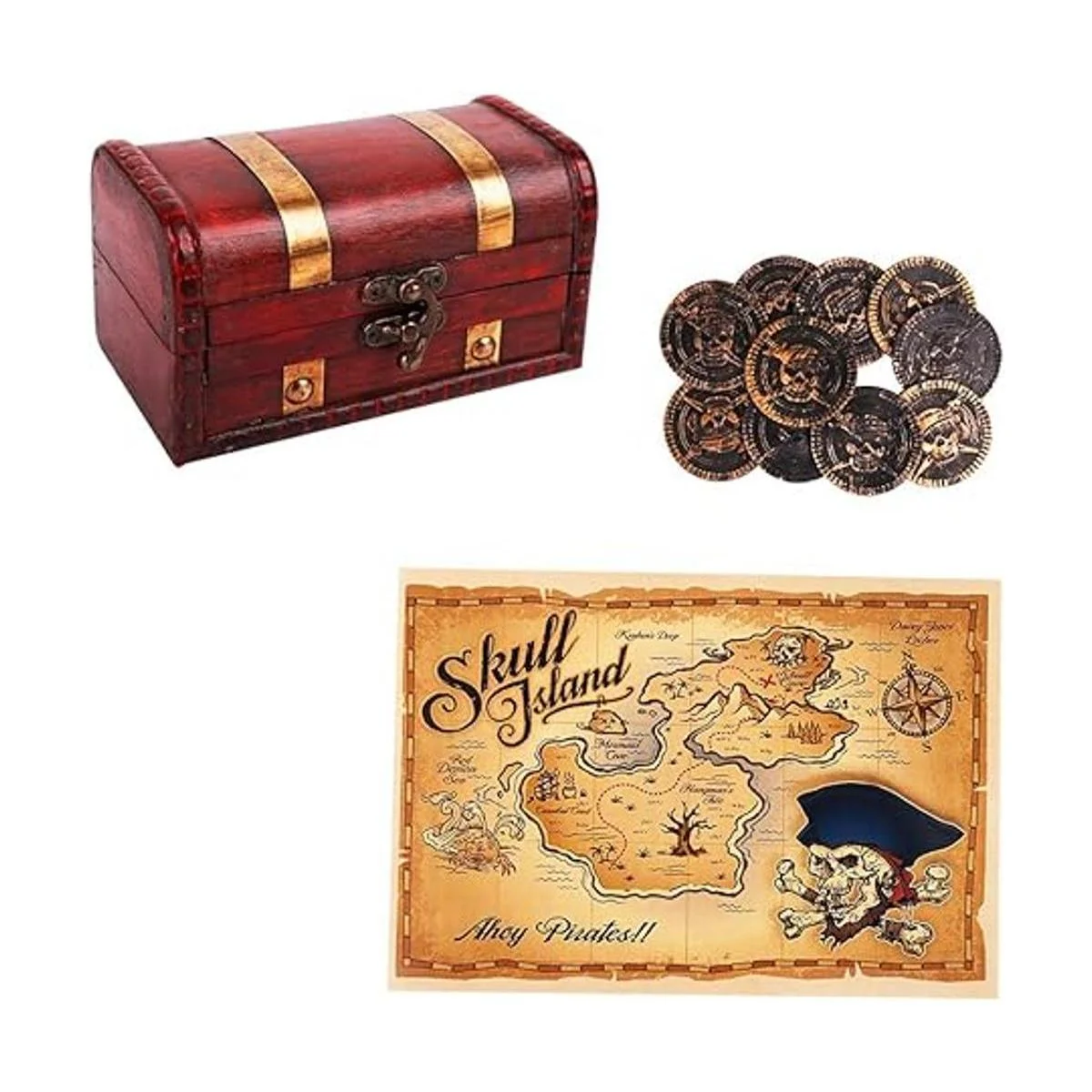 Cofre del tesoro pirata vintage, incluye 10 monedas piratas de plástico y 1 mapa del tesoro