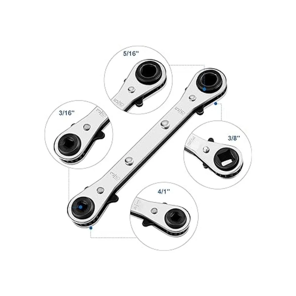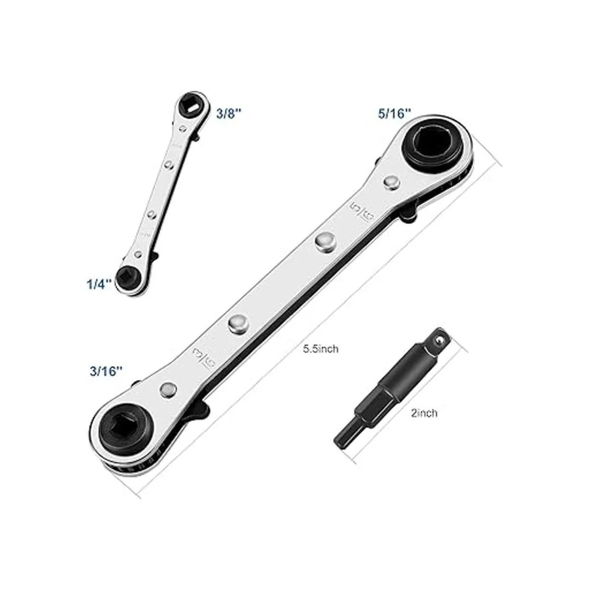 4 tamaños diferentes: 1/4, 3/8, 3/16, 5/16. Estos tamaños son los tamaños de llave más utilizados al reparar el equipo de acondicionamiento de aire y refrigeración.