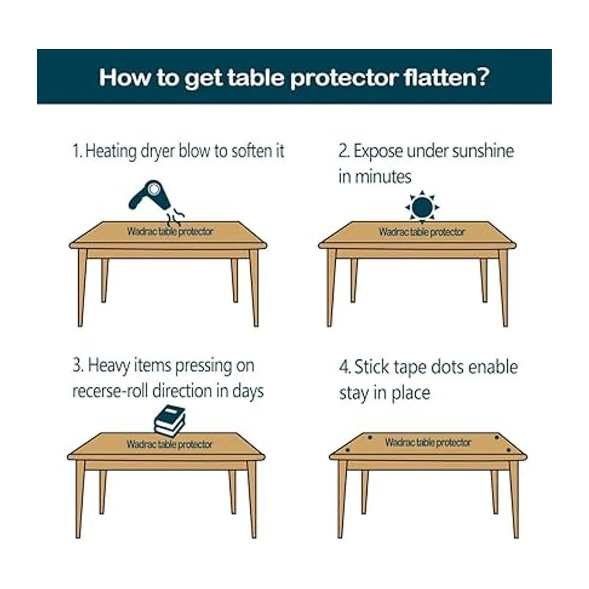 Consejos: Cómo hacer que el mantel de vinilo sea plano Utiliza un secador de pelo calentándolo después de colocarlo. Coloca el protector de mesa de PVC en la dirección inversa, utiliza artículos resistentes presionándolo en días; Empape en agua caliente o exponga bajo el sol en cuestión de minutos; o pegue puntos de cinta de doble cara entre la mesa y el protector de mesa de vinilo. Manteles transparentes resistentes al calor máximo a 81 centígrados o 176 grados Fahrenheit. Protector de mesa para muebles resistente al agua