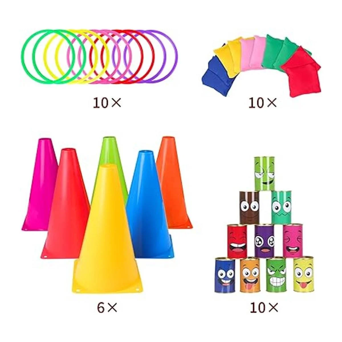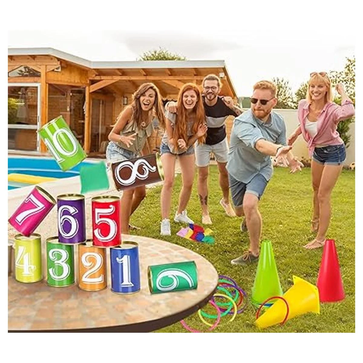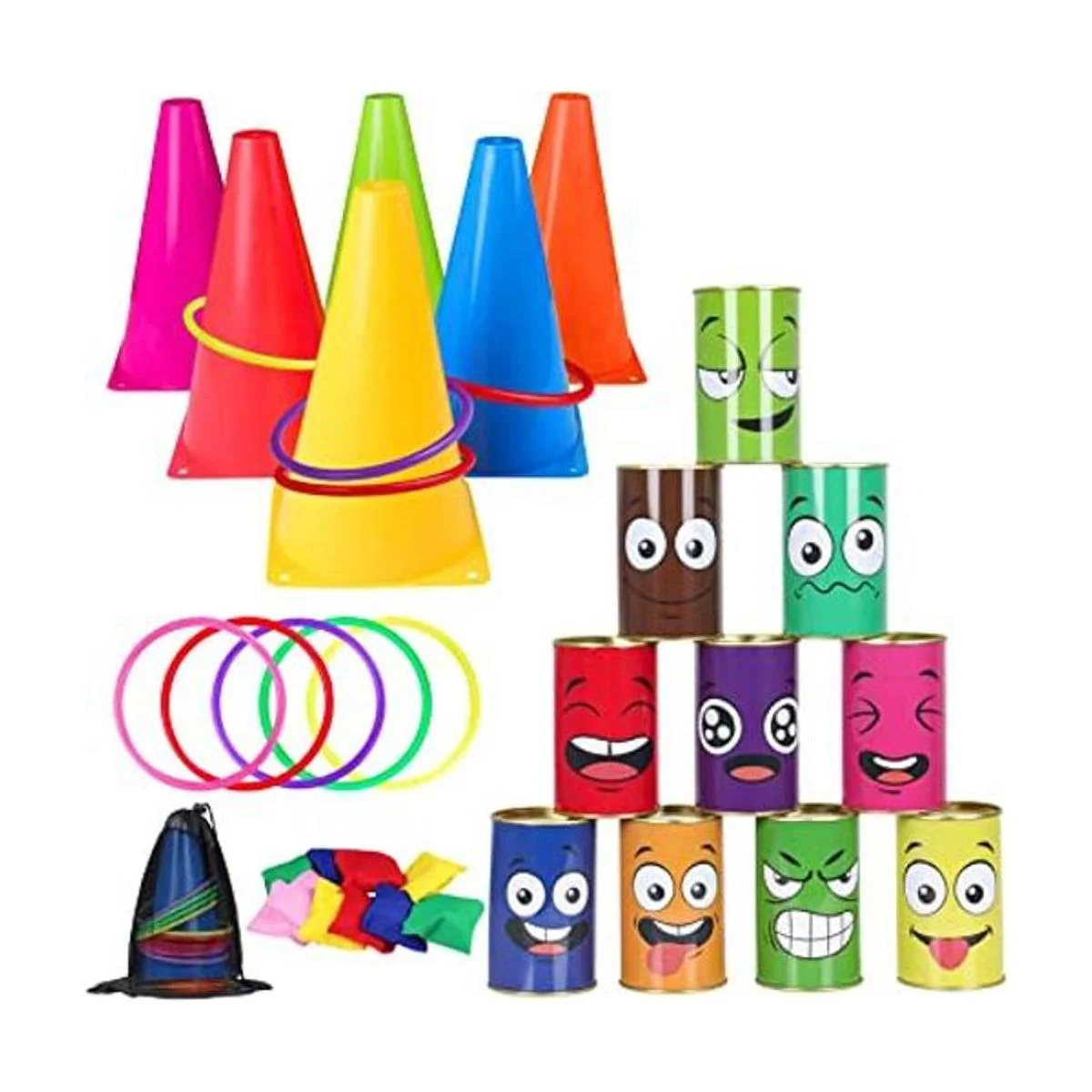 Juegos de latas de lanzamiento de bolsas de frijoles: simplemente apila estas latas de carnaval en una pirámide, luego tira el puf para derribarlas, y el que derribó la mayoría de latas gana, o utiliza los números en la parte posterior de cada lata para calcular la puntuación total del juego derribado por los jugadores para cada ronda. Juego de lanzamiento de anillos: para cualquier juego de lanzamiento de anillos, juego de puf, juegos de carnaval y carrera de obstáculos para niños