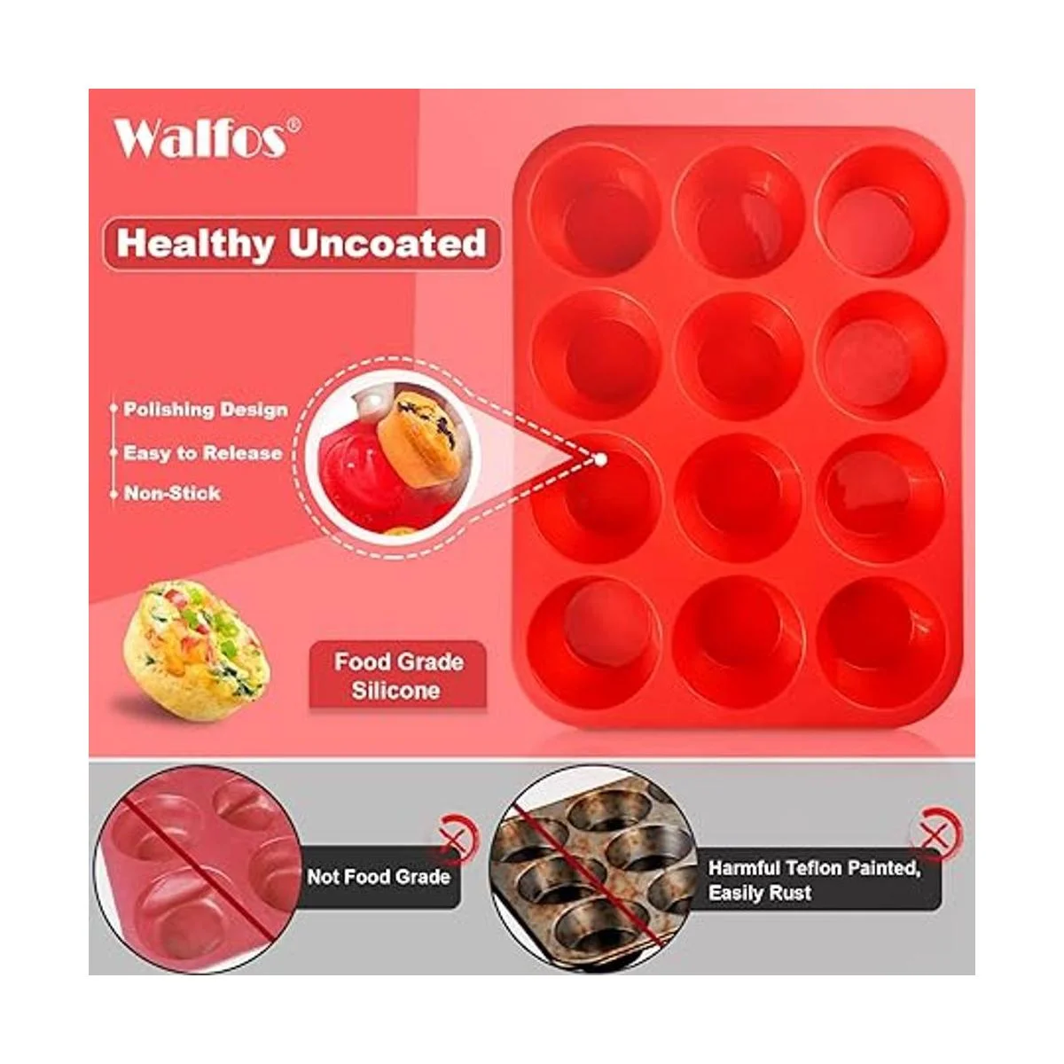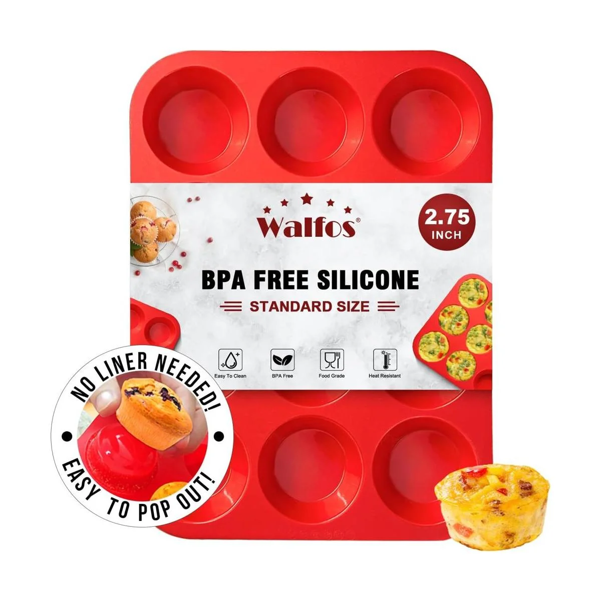 Walfos Molde para magdalenas de silicona, 12 tazas de silicona regular, silicona antiadherente, ideal para hacer pasteles de magdalenas, tartas, pan, sin BPA y apto para lavavajillas