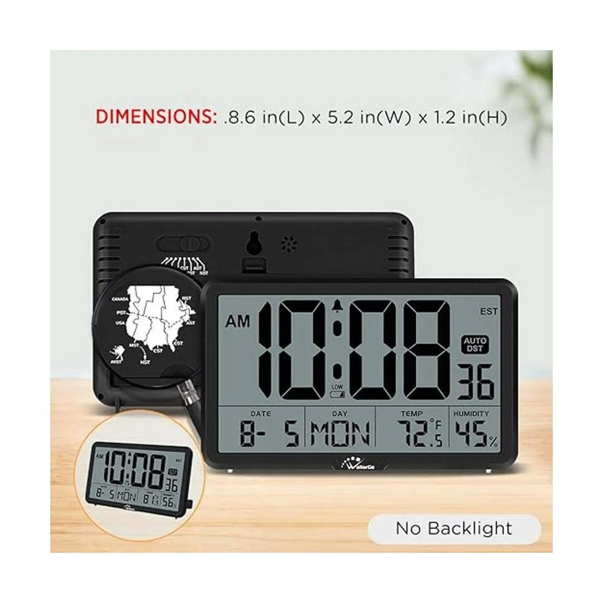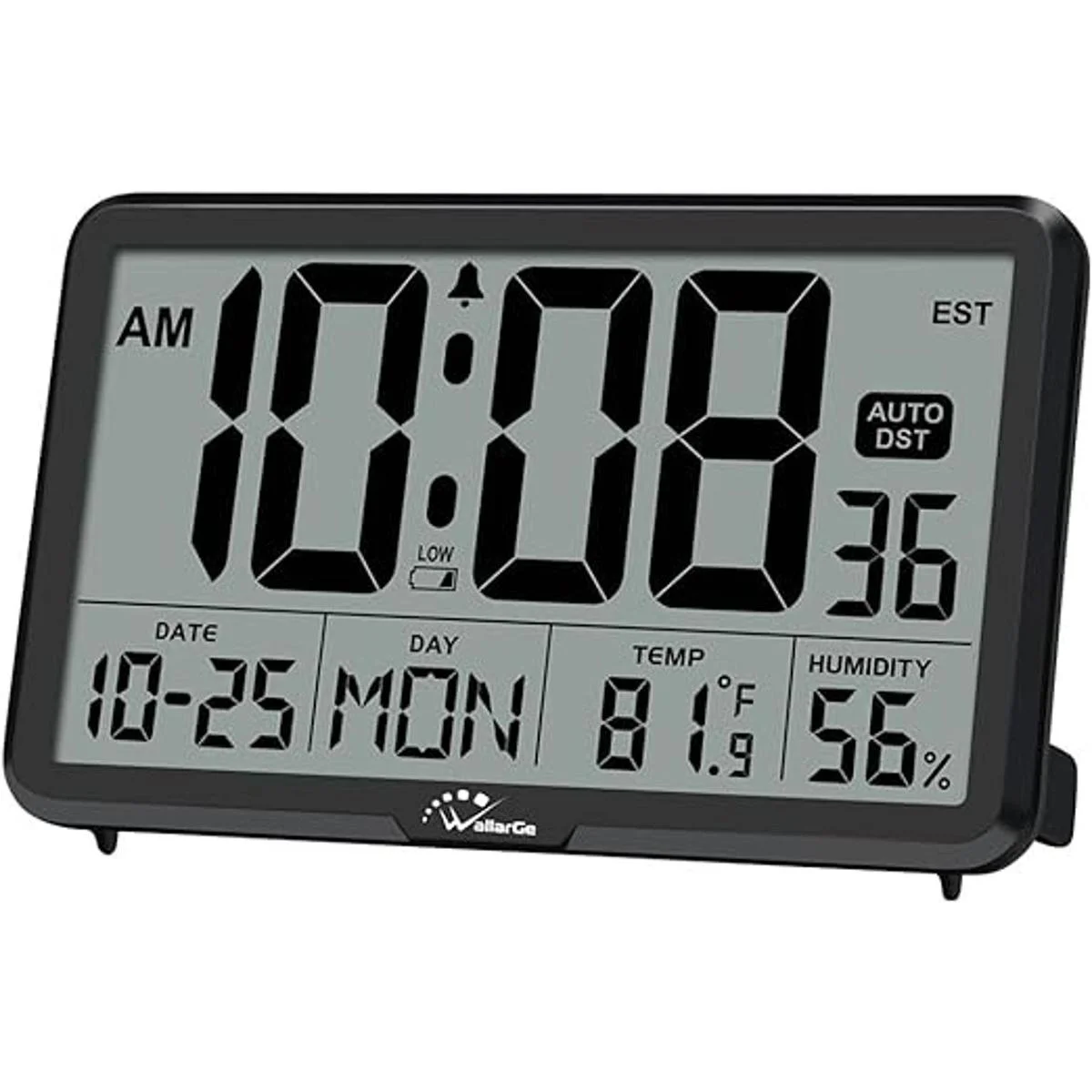 WallarGe Reloj de pared digital automático funciona con pilas, relojes de escritorio con temperatura, humedad y fecha, calendario digital de pantalla grande para ancianos, dormitorio, oficina, 8 zonas horarias, DST automático.