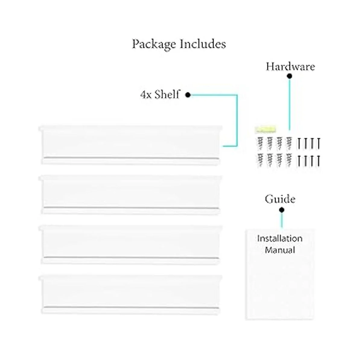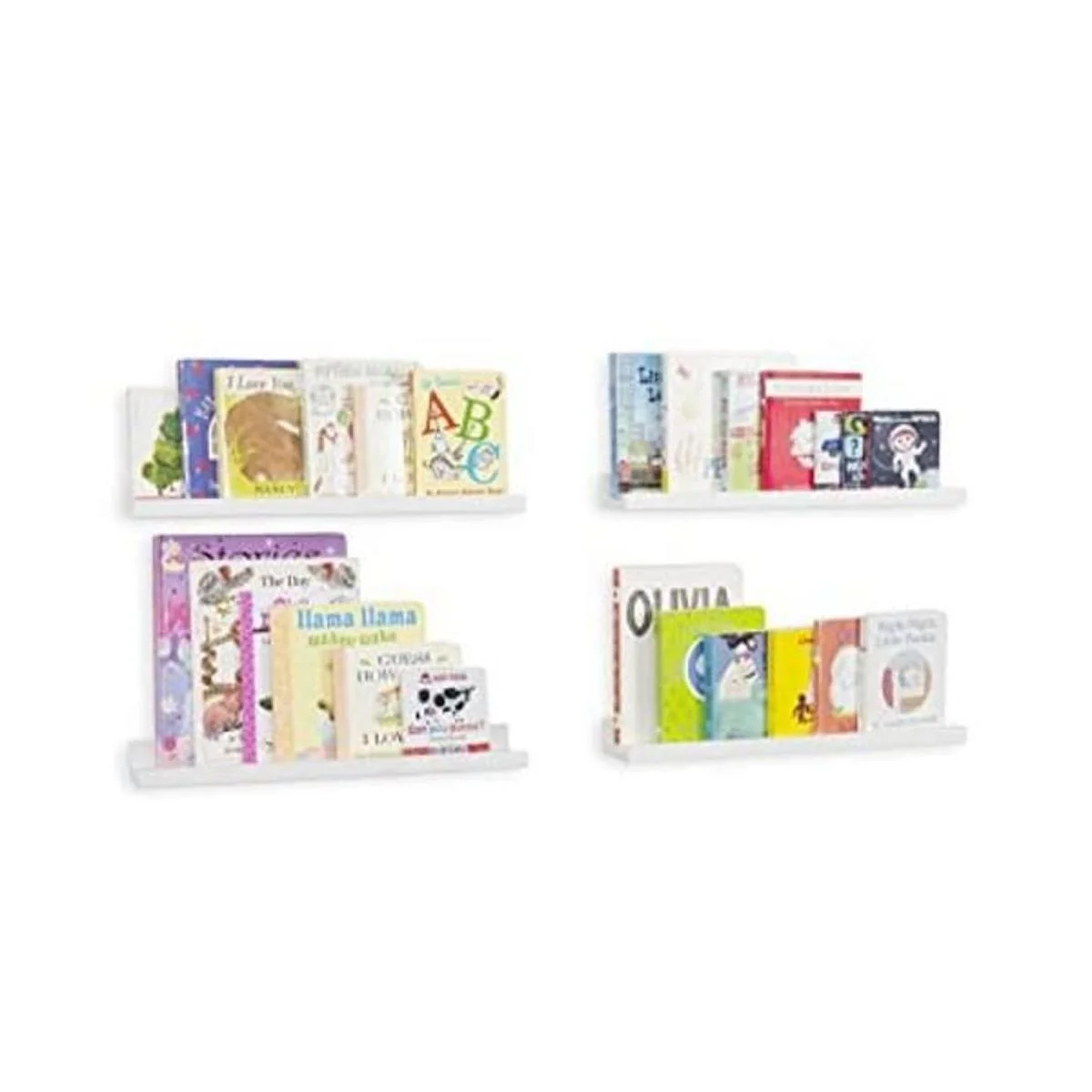 Construcción resistente: el juego de 4 estanterías flotantes blancas de 17 pulgadas para niños se puede escalonar en la misma pared o utilizar en diferentes habitaciones para una solución asequible y versátil para organizar más a la vez. Los elegantes estantes blancos aportan organización, estilo de diseñador y decoración a salas de juegos o dormitorios desordenados