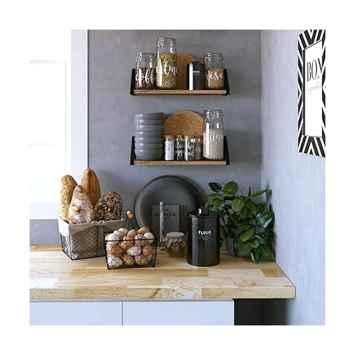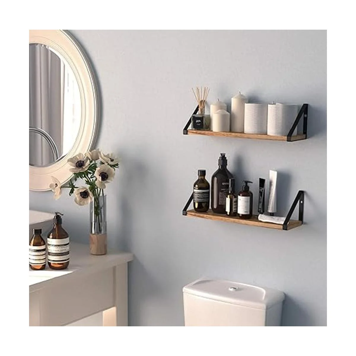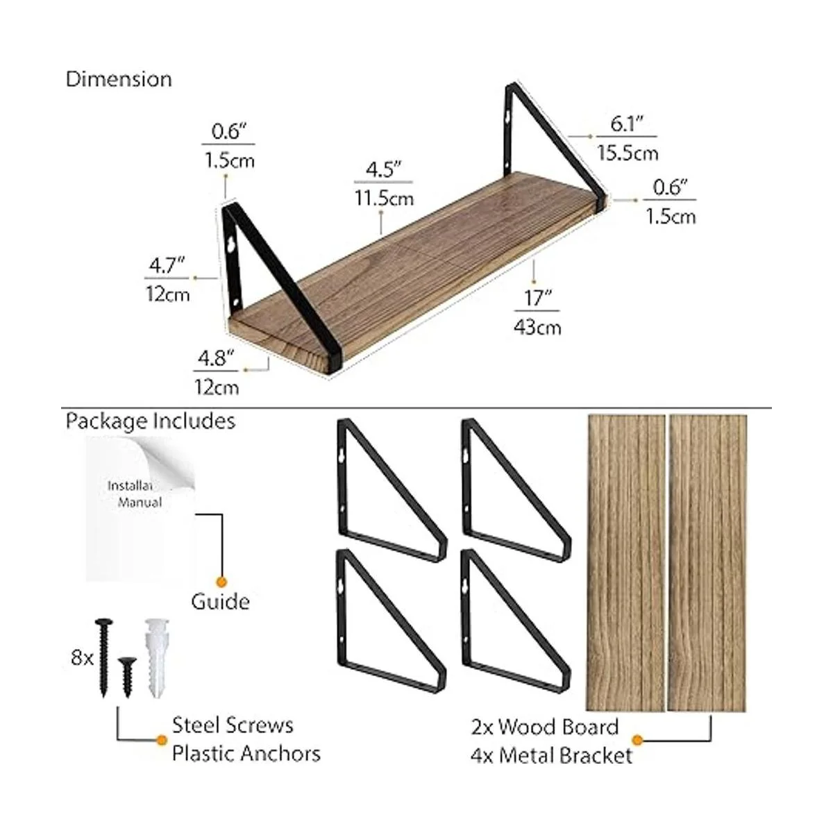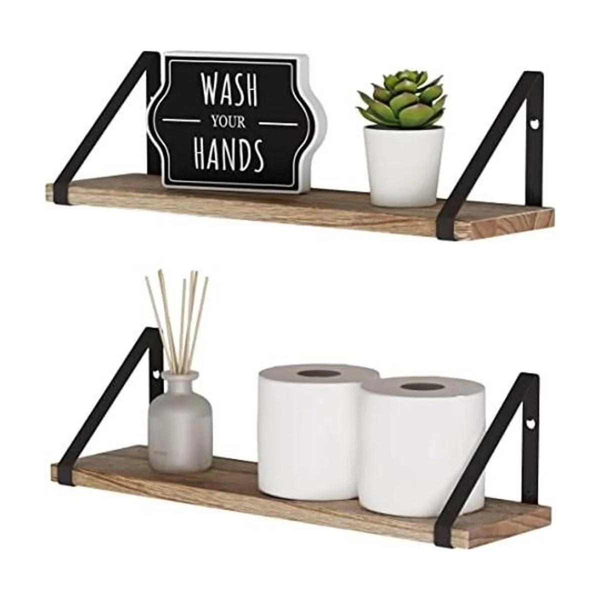 Wallniture Estantes flotantes de almacenamiento de baño, montaje en pared, decoración del hogar, dormitorio, cocina, lavandería, organizador con soportes negros y estantes de madera rústica quemada natural, juego de 2