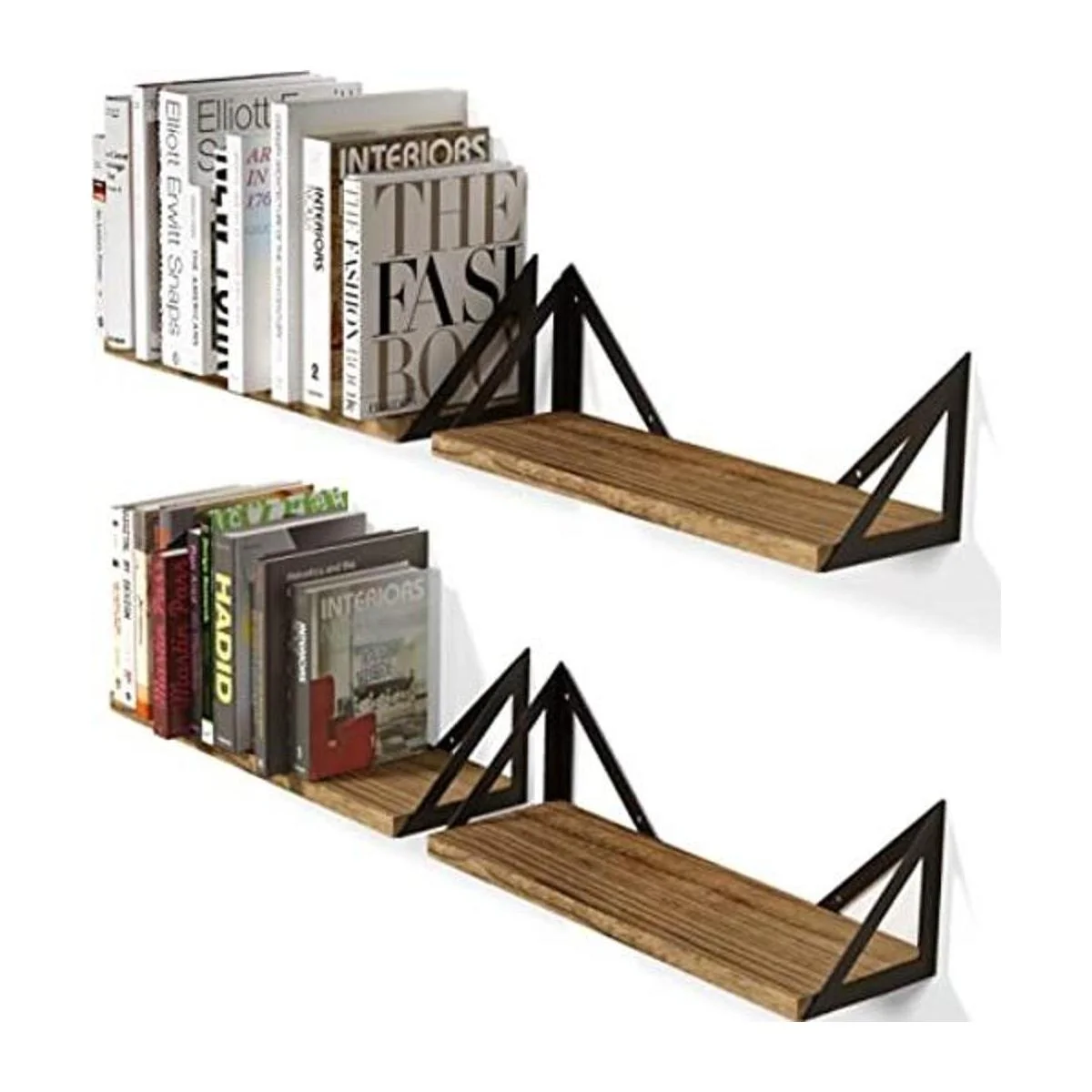 Wallniture Minori Juego de 4 estantes flotantes, pequeña estantería para dormitorio, oficina, baño y sala de estar, decoración de pared de madera rústica quemada natural con soporte flotante de metal