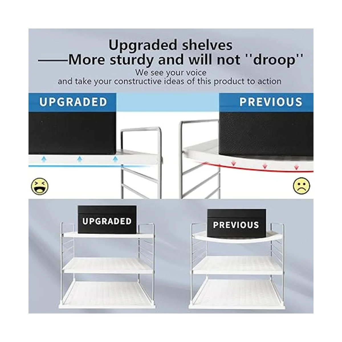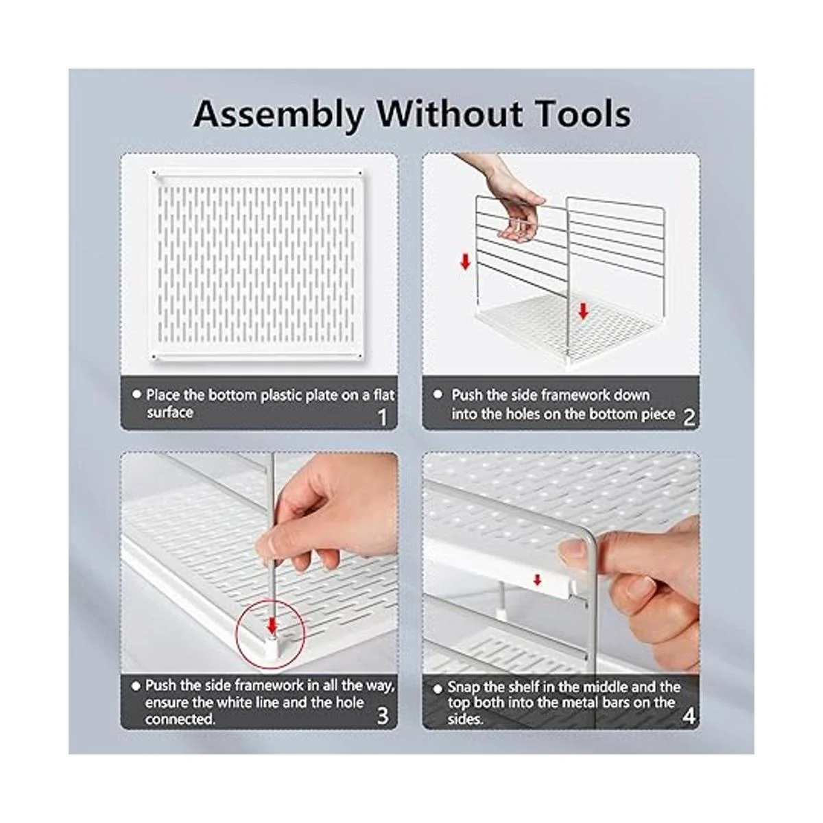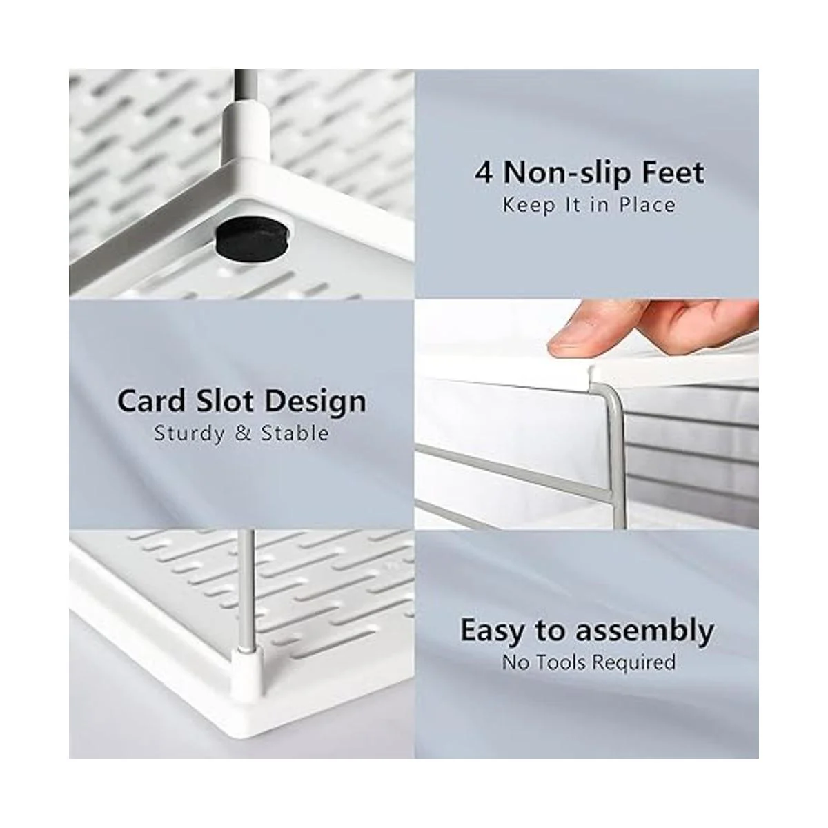 Los estantes encajan en los soportes y se ajustan juntos, 4 pies antideslizantes mantienen el organizador de la caja de cocina en su lugar, simplemente fácil acceso a él sin golpearlo por todas partes