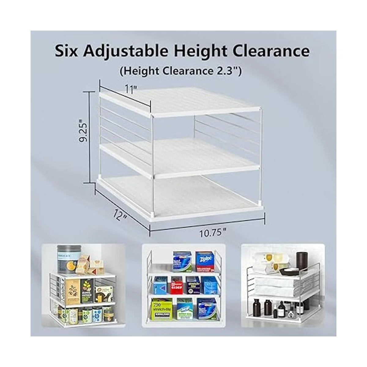 Montado en un minuto y no necesita herramientas. Tamaño: 10.75 pulgadas de ancho x 12 pulgadas de profundidad x 9.25 pulgadas de alto, el estante organizador soporta hasta 15 libras