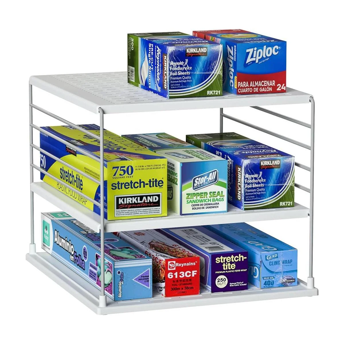 Seis espacios de altura ajustable obtienen papel de aluminio de diferentes tamaños, envoltura de plástico, bolsas, cajas, aperitivos alineados y mejor organizados