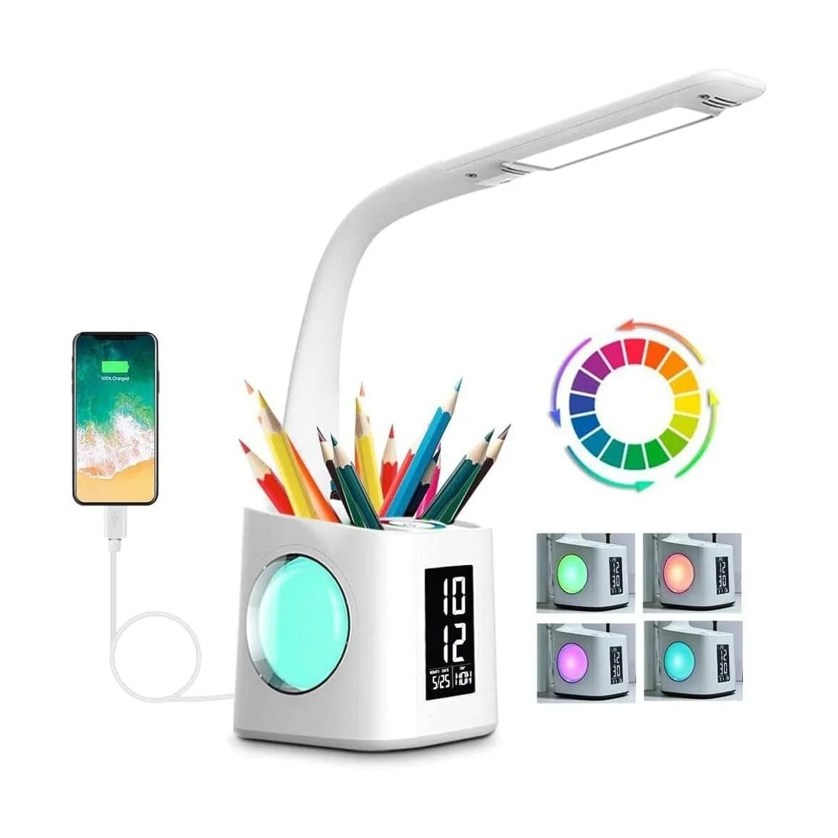 wanjiaone Lámpara de escritorio LED de estudio con puerto de carga USB, pantalla, calendario y luz nocturna de color, lámpara de mesa LED regulable con soporte para bolígrafo y reloj, luz de lectura de escritorio para estudiantes, 10 W