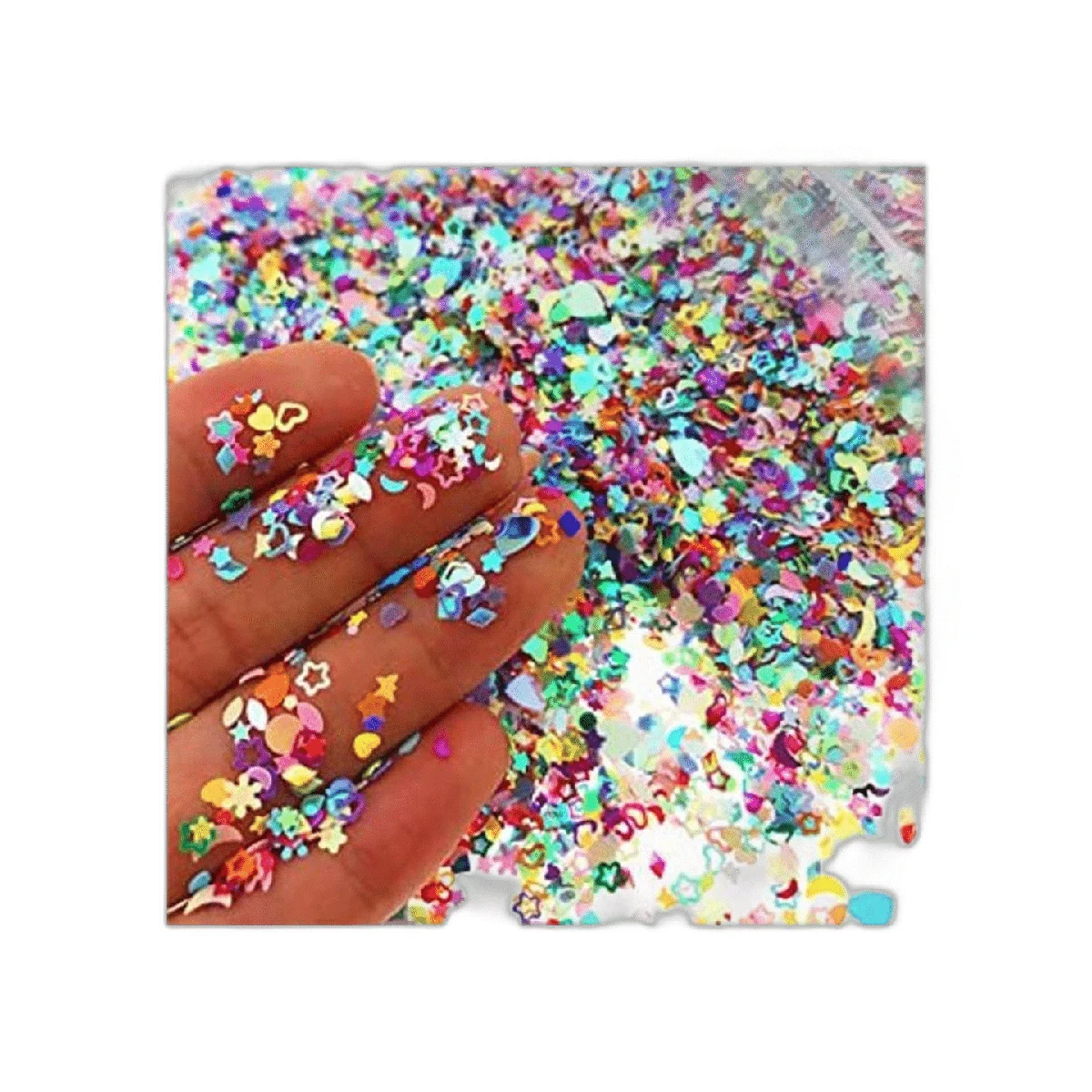 7.05 oz de confeti multicolor con purpurina para manicura. Cada tamaño varía entre 2 y 0.157 in.