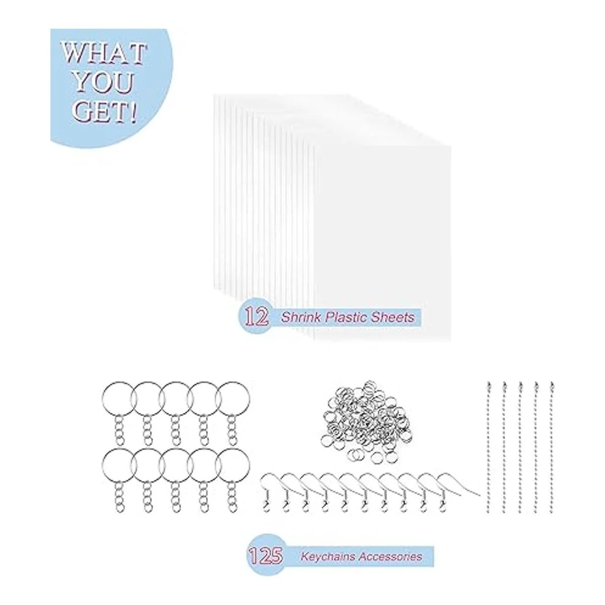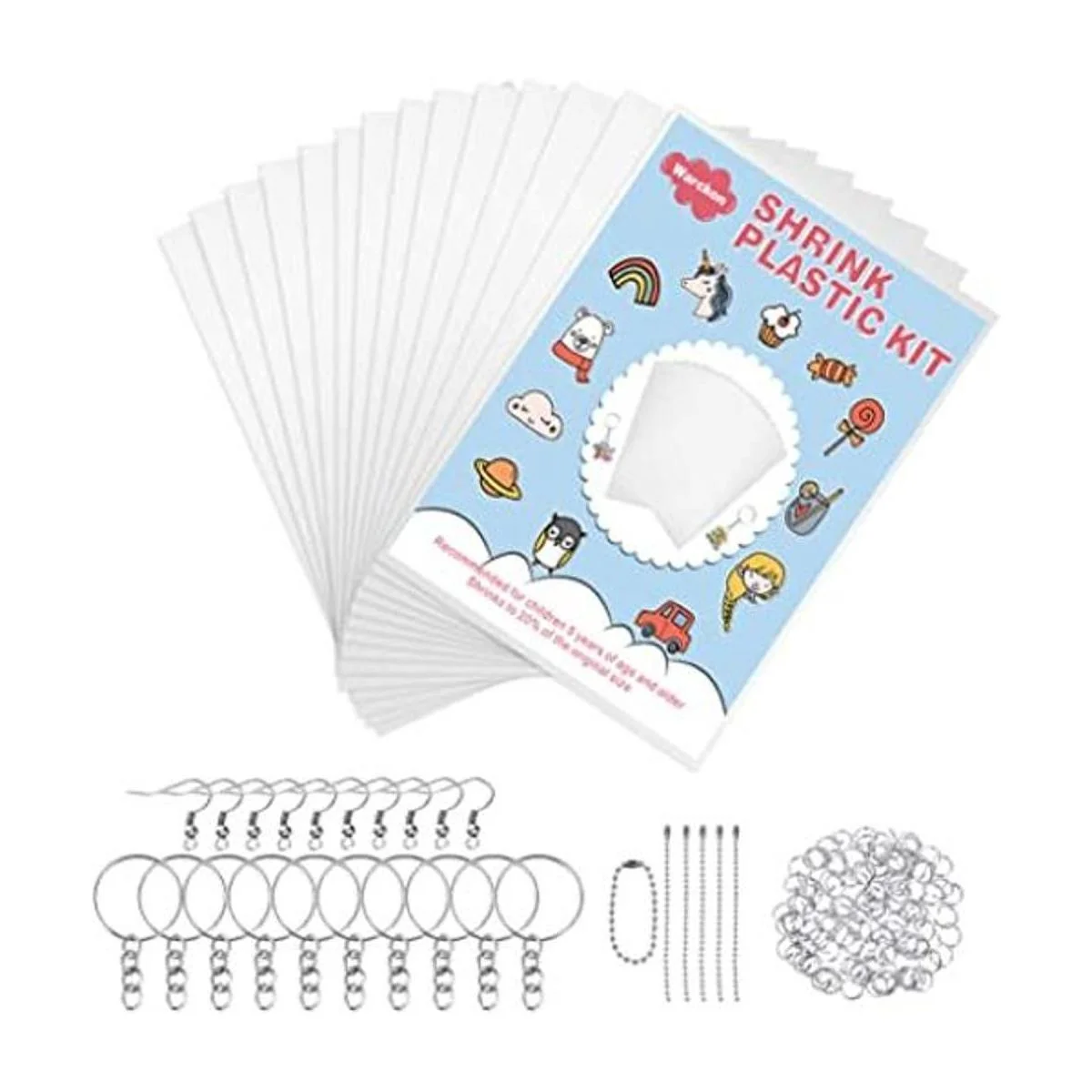 Warckon El kit de hojas de plástico retráctil de 137 piezas incluye 12 papeles de arte encogido con 125 llaveros accesorios para manualidades creativas para niños