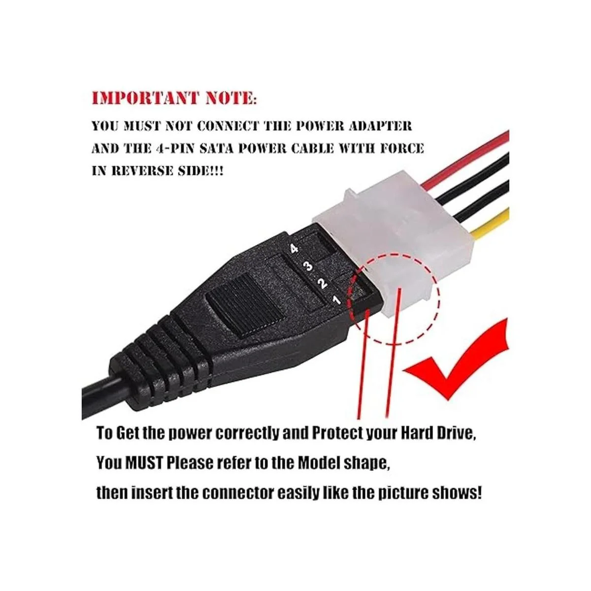 Nota importante: no debes instalar anormalmente el enchufe de 4 pines del cable de alimentación SATA en un enchufe de 4 pines de cable de alimentación de CA con gran fuerza. Consulta la forma del modelo e inserta el conector correctamente como se muestra en la quinta imagen del producto