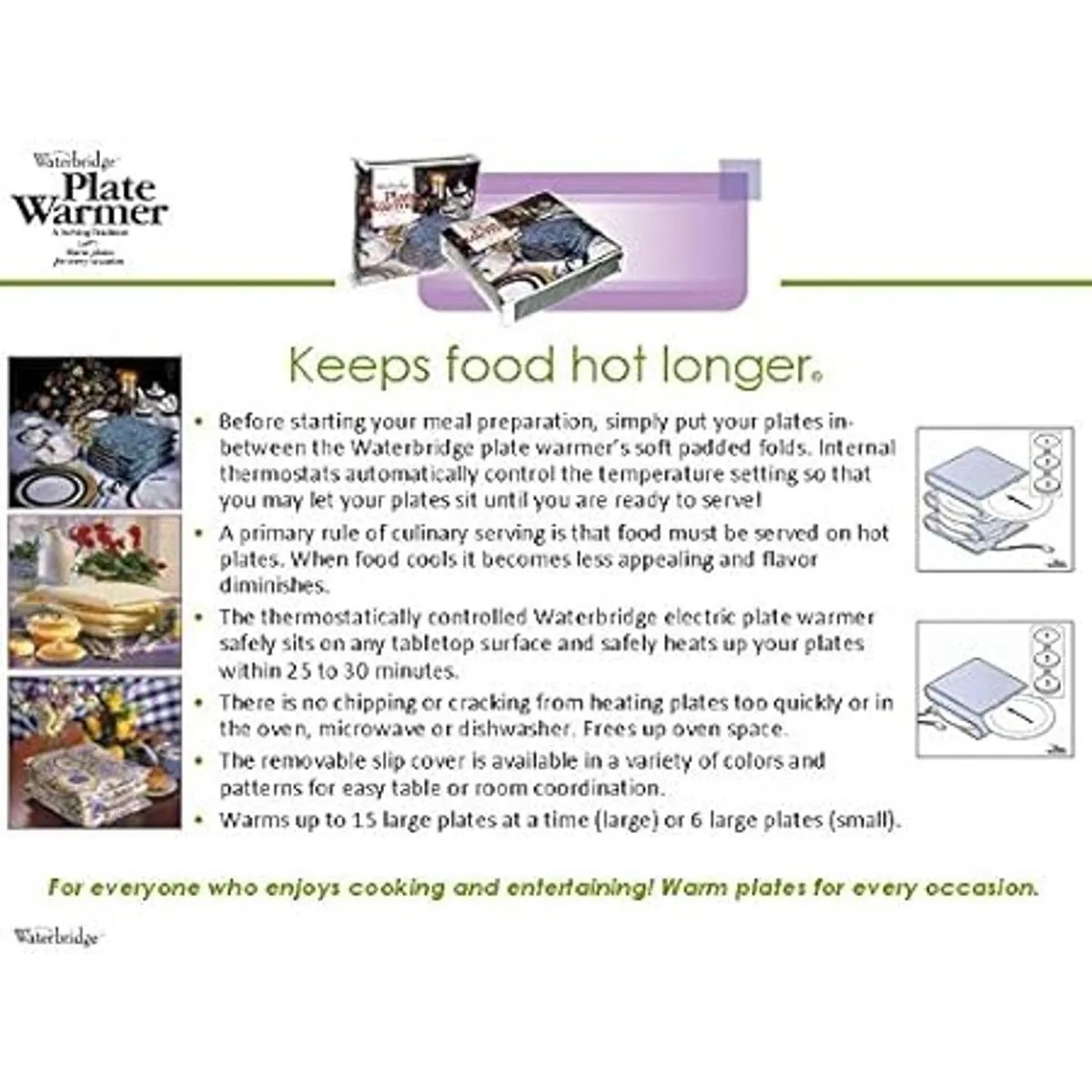 Una almohadilla de calefacción eléctrica controlado por termostato calienta platos a un caliente y cómodo de la temperatura de 150 grados Fahrenheit. La base almohadilla protege todas las superficies mesa. cubiertas 95 de la superficie de la placa con aislamiento Zona. hecho para N.A. platos de tamaño hay una diferencia. nuestra funda antideslizante está hecha de calidad De suave forro polar de poliéster. muy funcional. Incluye un claro bolsa con cierre de cierre para fácil almacenamiento Plus una año de garantía limitada de 10 cm. Fabricado y montada en N.A. desde 97. Plus no impuesto. comprar cualquier 2 waterbridge Calentadores de placa y ahorra un 15 adicional para ver todos los diseños y tamaños.