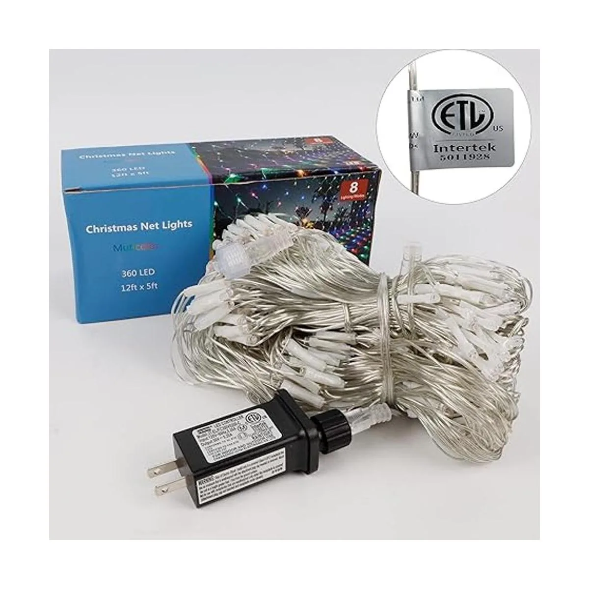 Luces de malla de Navidad: Luces decorativas de red multicolor, vienen con 360 luces LED superbrillantes y adaptador certificado UL. Enchufe de bajo voltaje, seguro para el cuerpo humano. Disfruta de las luces de red parpadeantes agradablemente. Tamaño de la malla: 12 x 5 pies, con cable de 16.5 pies. Se puede extender a un máximo de 3 cadenas de luz máximo 1000 LED, para decorar tu zona de iluminación con la longitud deseada.