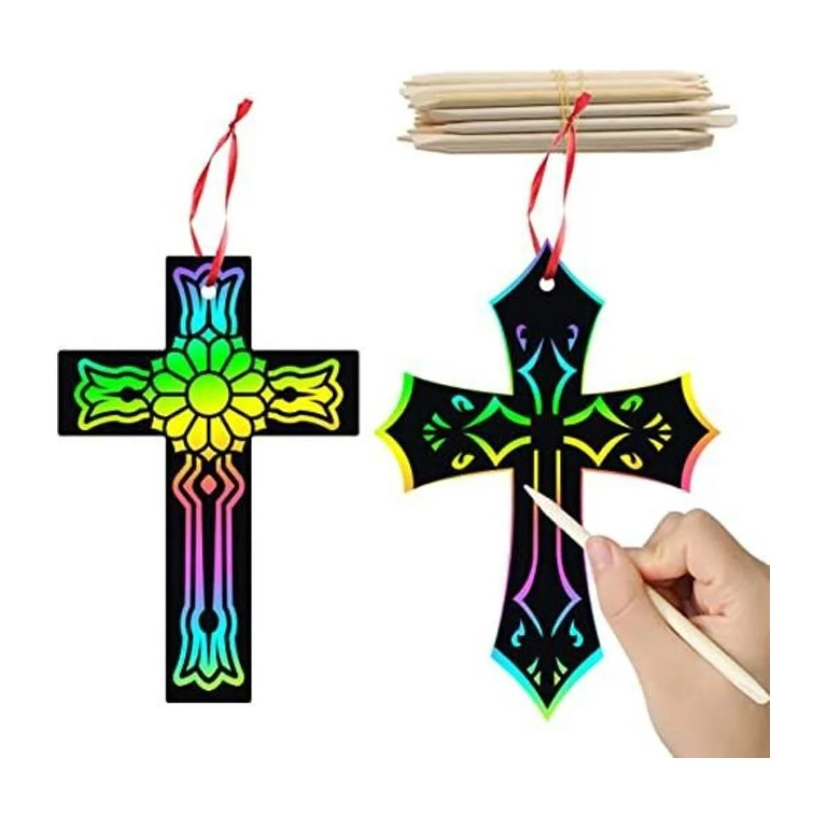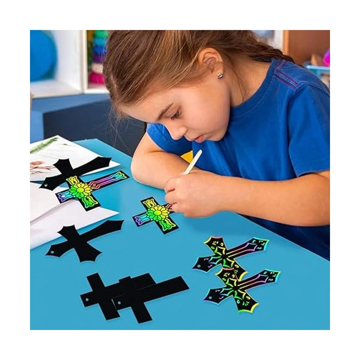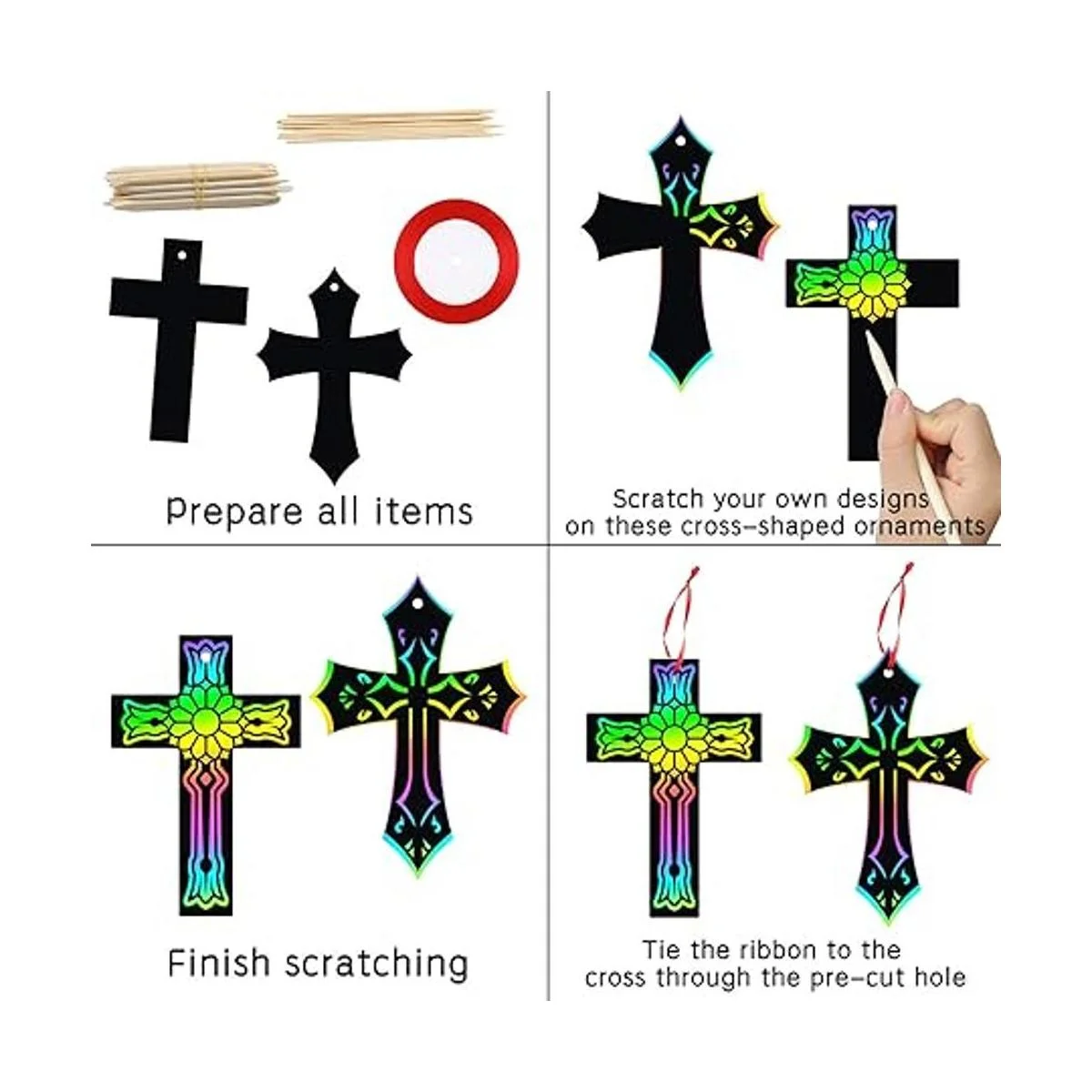 Material: nuestros adornos de cruz para rascar están hechos de cartón de papel grueso, los palos de madera están hechos de madera y la cinta colgante está hecha de satén. Todos son no tóxicos e inofensivos para niños y adultos.