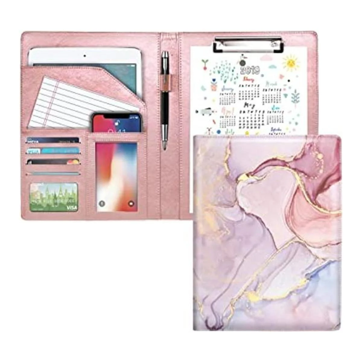 Organizador multifuncional de documentos de mármol: cartera como portapapeles, adecuado para papel A4, clip fuerte que mantiene el papel estable. Esta cartera de cuero también está diseñada con bolsillos. 4 soportes para tarjetas, un soporte para teléfono, un lazo para bolígrafo, un bolsillo central y bolsillo para currículum. papel y bolígrafo no incluidos.