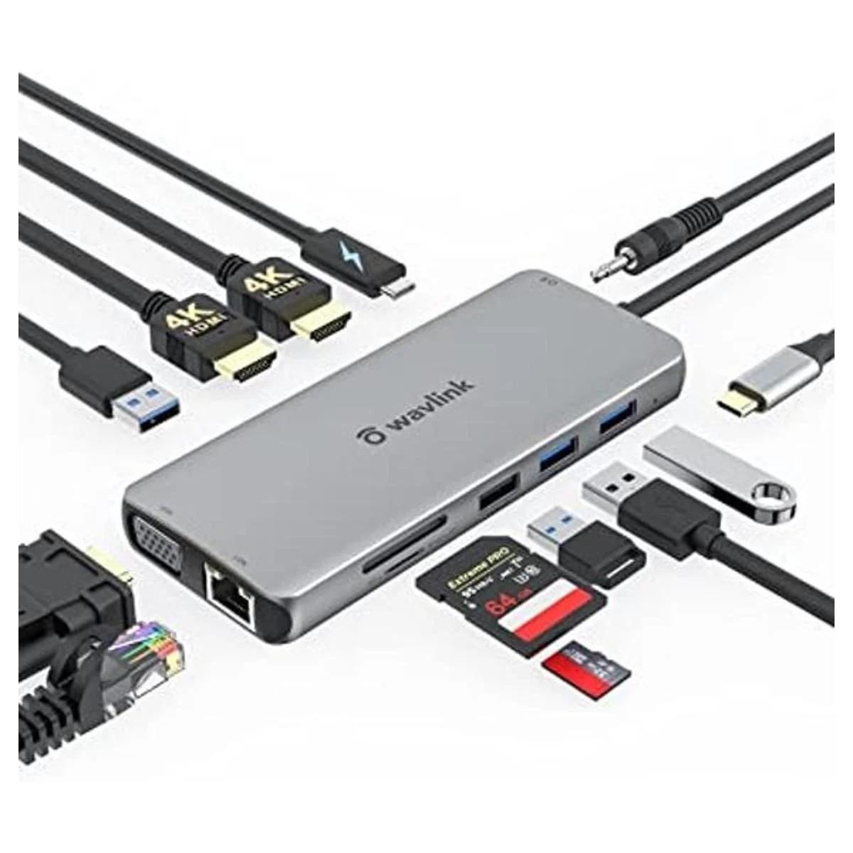 WAVLINK Estación de acoplamiento USB C de doble monitor para laptop Dell HP Surface Lenovo MacBook, adaptador multipuerto USBC de triple pantalla, 2 HDMI, VGA, Ethernet, 100 W PD, 5 USB, lector de tarjetas SDTF, audio