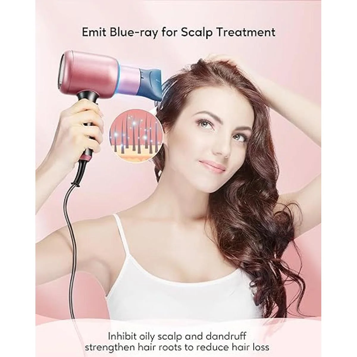 Tecnología Blue Ray para tratar el cuero cabelludo: equipado con tecnología Blueray, este secador de pelo de cerámica emite rayos azules que son antiinflamatorios y ayudan a regular el equilibrio del pH del cuero cabelludo, inhibe el cuero cabelludo graso y la caspa, así como fortalece las raíces del cabello para reducir la pérdida de cabello.