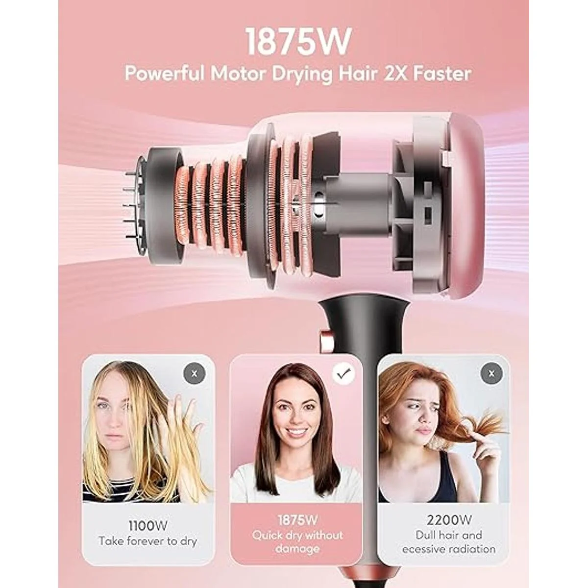 Potente motor de 1875 vatios que seca el cabello 2 veces más rápido: con 1875 vatios de potencia, este secador de pelo deja secar el cabello en solo 5 minutos. El motor ADC optimiza el flujo de aire y reduce la dispersión, para un máximo rendimiento mientras bloquea la humedad para un cabello saludable e hidratado.