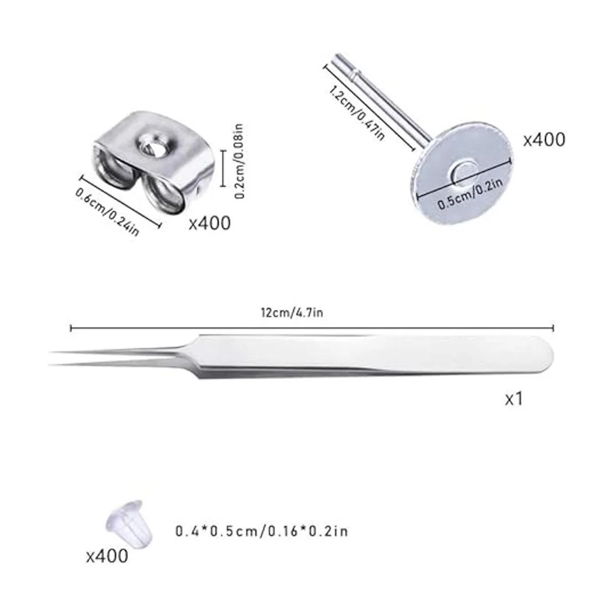 Paquete: 200 pares/400 piezas de aretes de tuerca, 200 pares de aretes de mariposa, 200 pares de cierres de silicona para aretes, una gran cantidad de postes de aretes y aretes pueden satisfacer tus necesidades