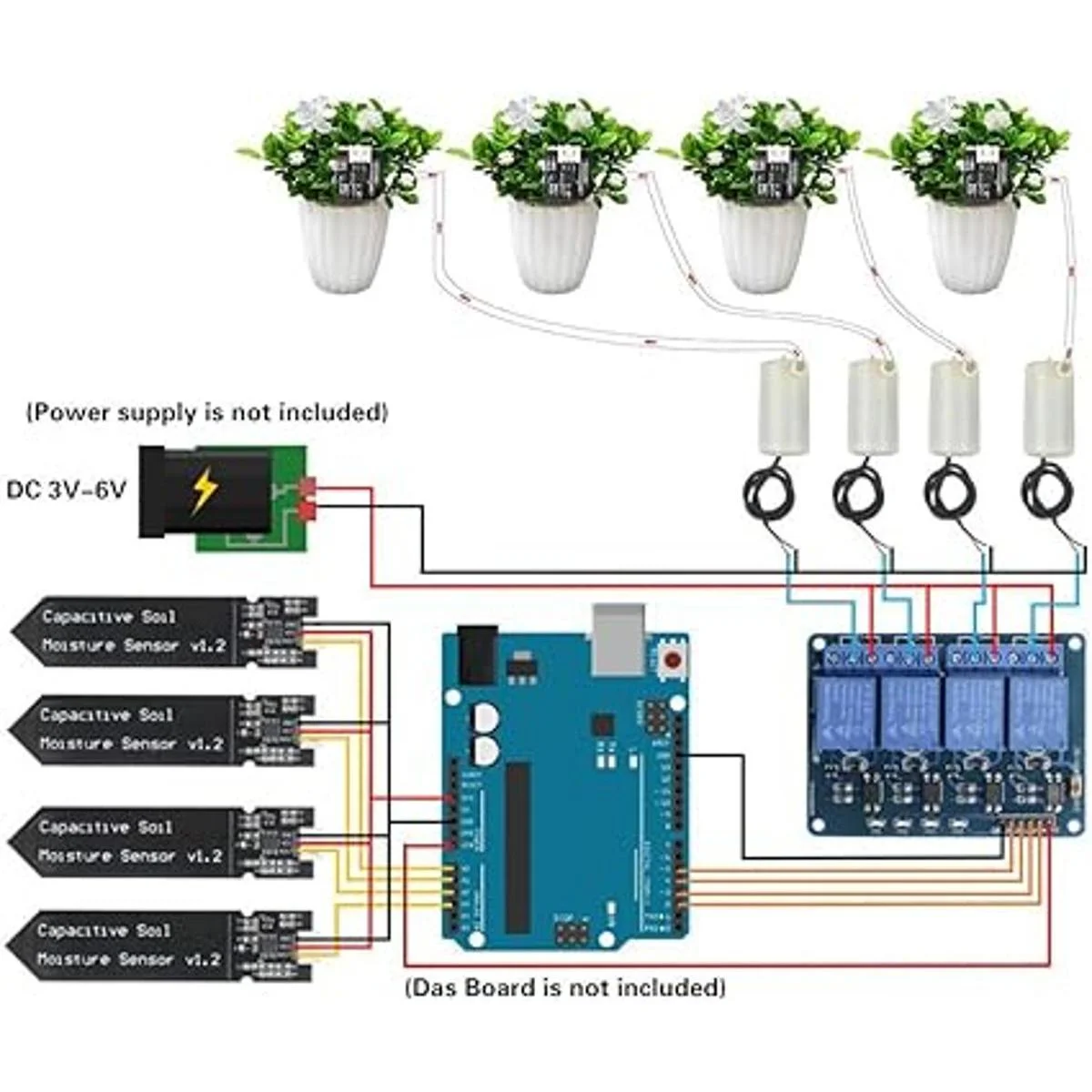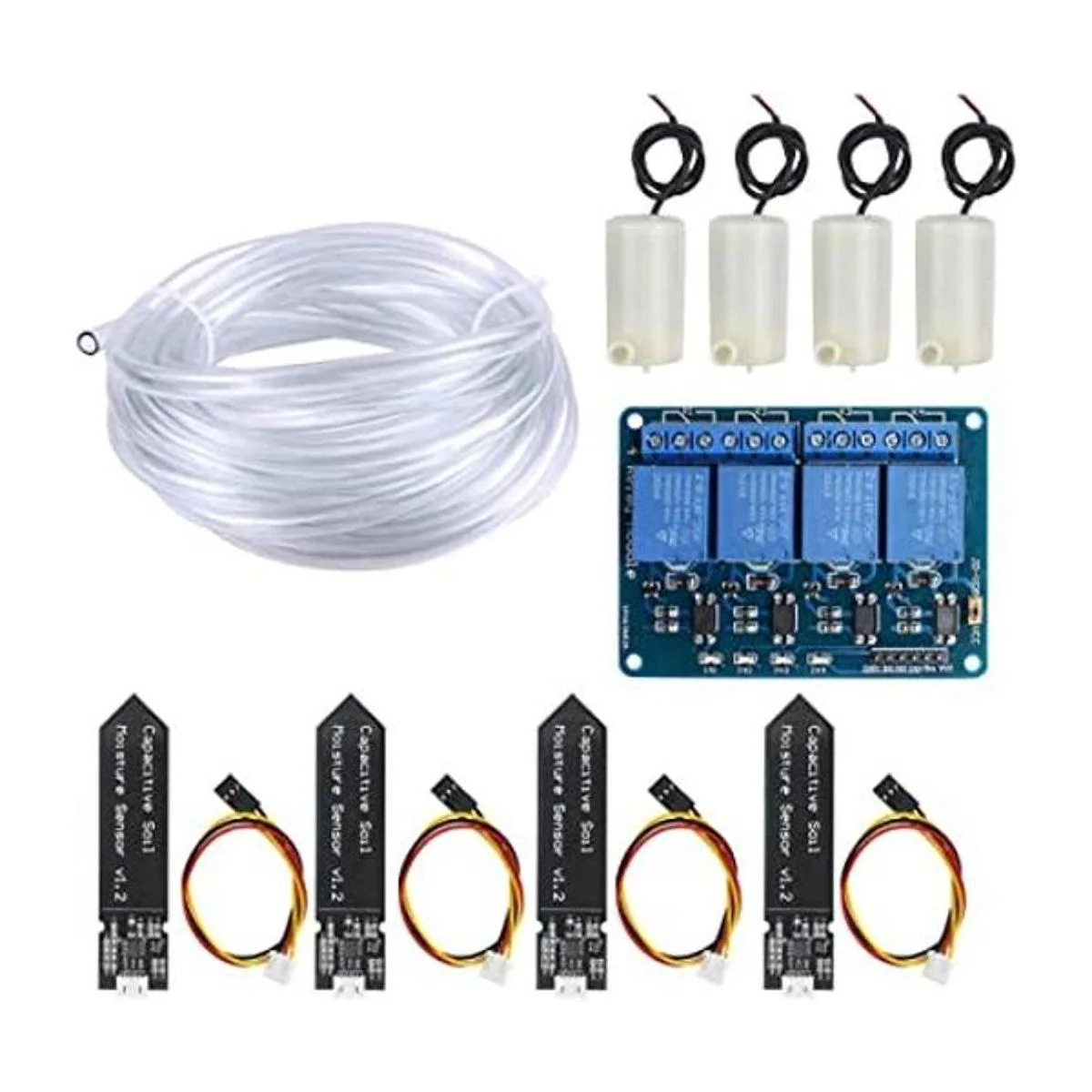WayinTop Kit de riego automático para bricolaje, sistema de riego automático con tutorial PDF, 4 sensores capacitivos de humedad del suelo, módulo de relé de 4 canales de 5 V y 4 bombas de agua + tubo de vinilo de 13.1 ft para plantas de jardín