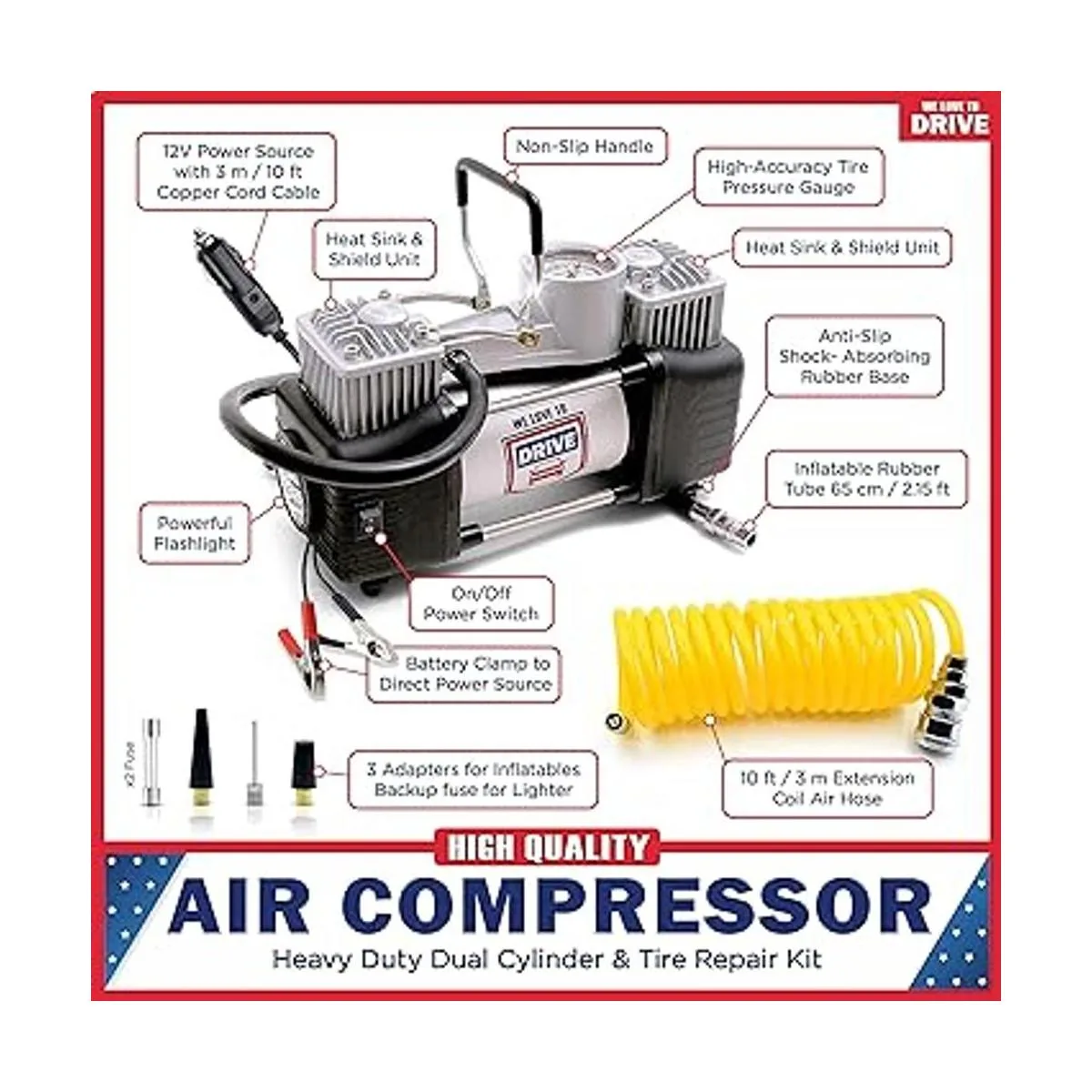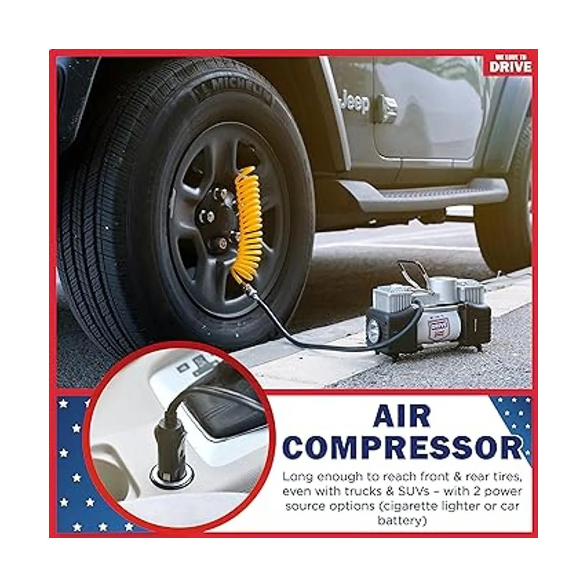 Aire adaptable: utiliza tu kit de compresor de aire de 12 V para inflar una variedad de neumáticos y equipos deportivos. Metal resistente o plástico duro, comprime el aire hasta 150 PSI y canaliza a través de tu elección de 3 adaptadores roscados diferentes.