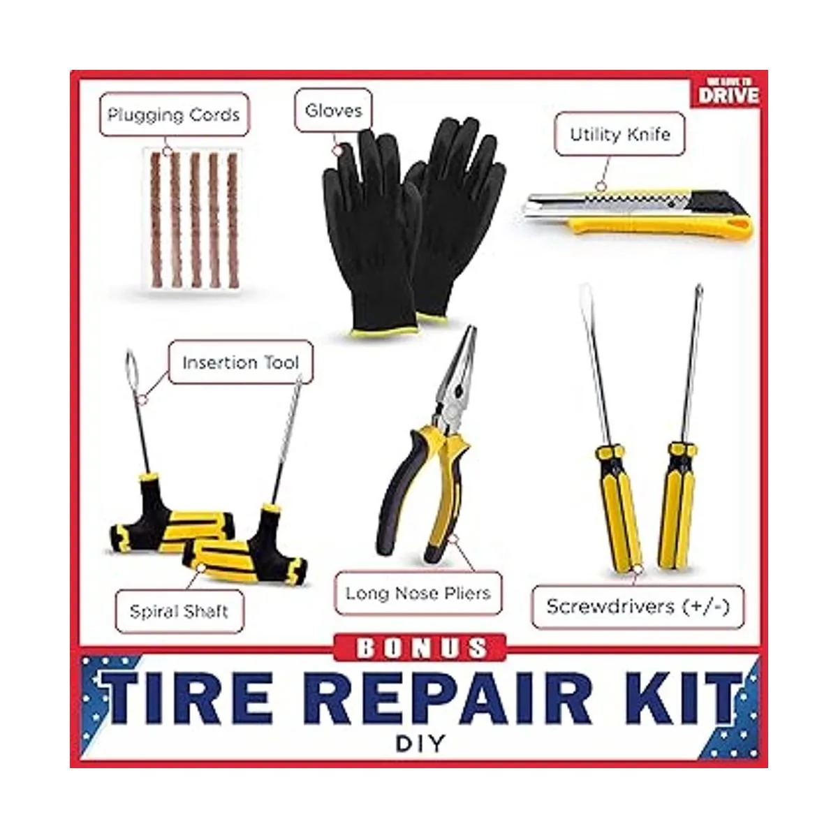 Kit de reparación completo: producto duradero que está hecho para durar. Evita que te quedes varado o tengas que utilizar un repuesto de dona gracias a tu kit de tapones de neumáticos. Utiliza una gama de herramientas diseñadas específicamente para moldear, llenar y sellar pequeños pinchazos dondequiera que estés.