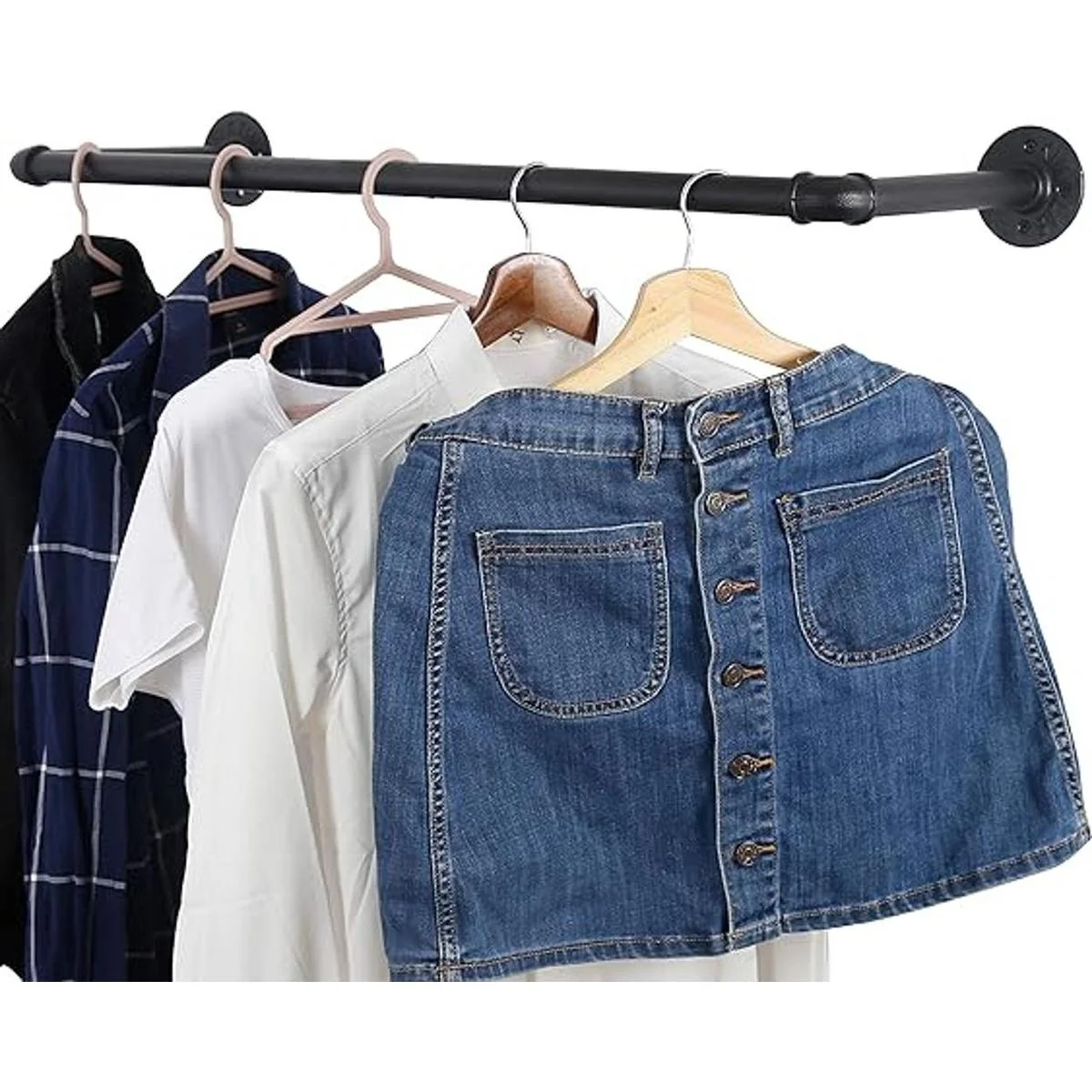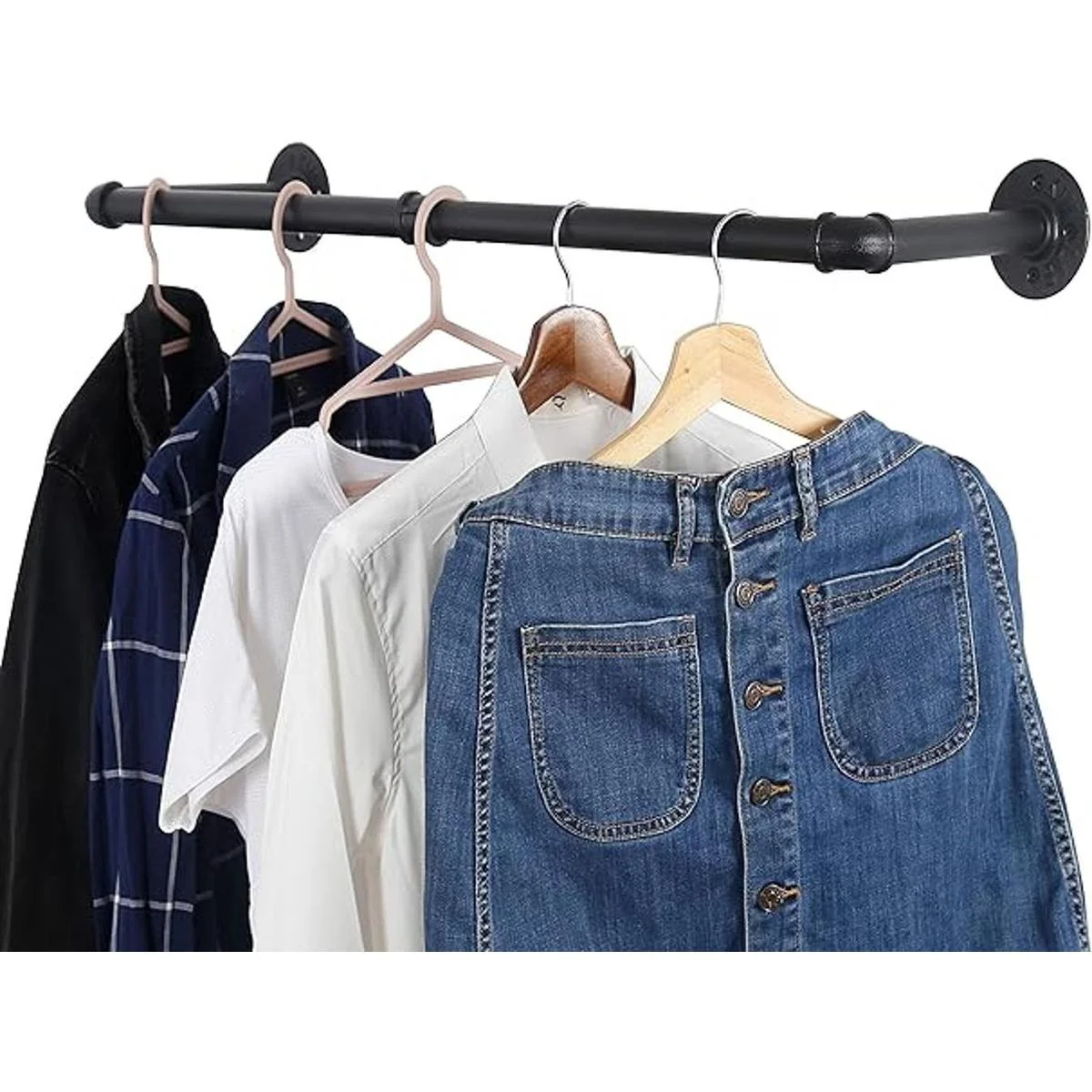 Longitud total desde la cara de montaje hasta la barra para colgar: 11 pulgadas, el perchero de tubería ofrece suficiente espacio para la mayoría de la ropa o perchas.